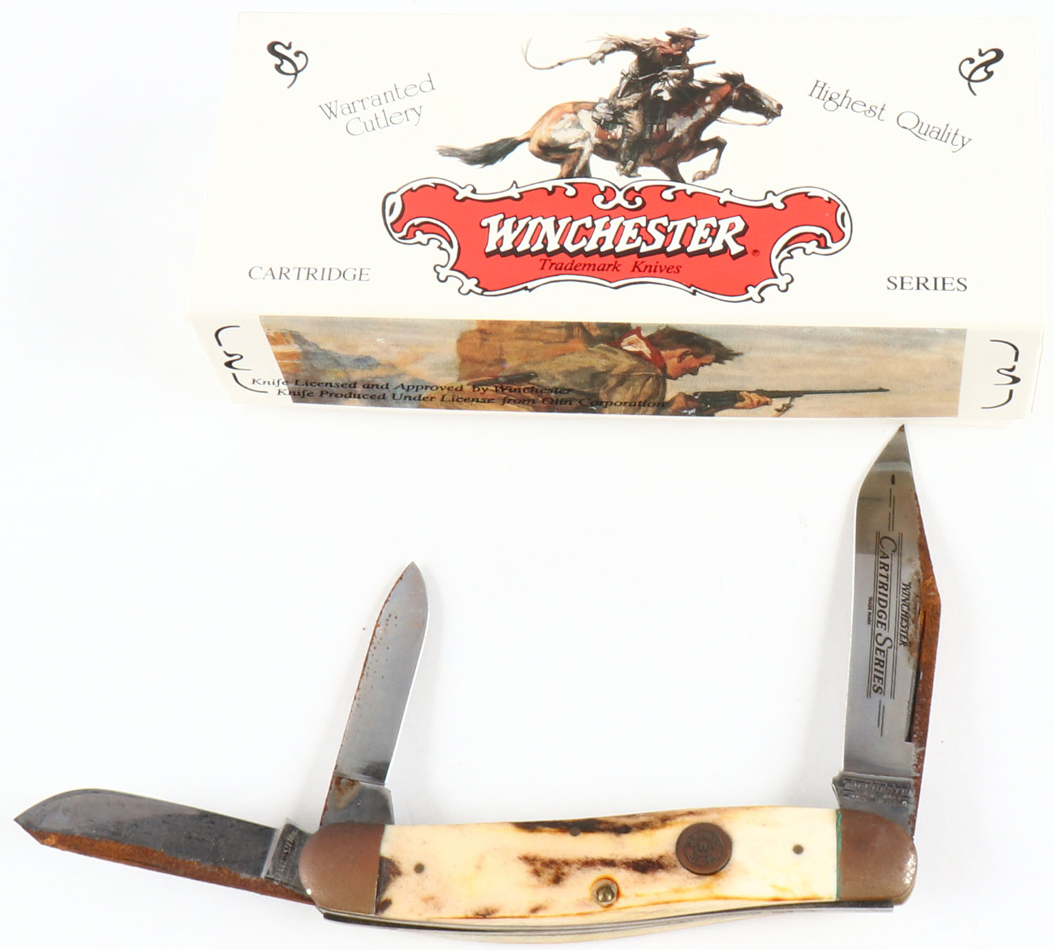 Winchester folding knife, in orginal box, No. W 18 350119 S, Stag Bone 30-30 Shield. Grade: Excellent ++ - Value: 30 to 90