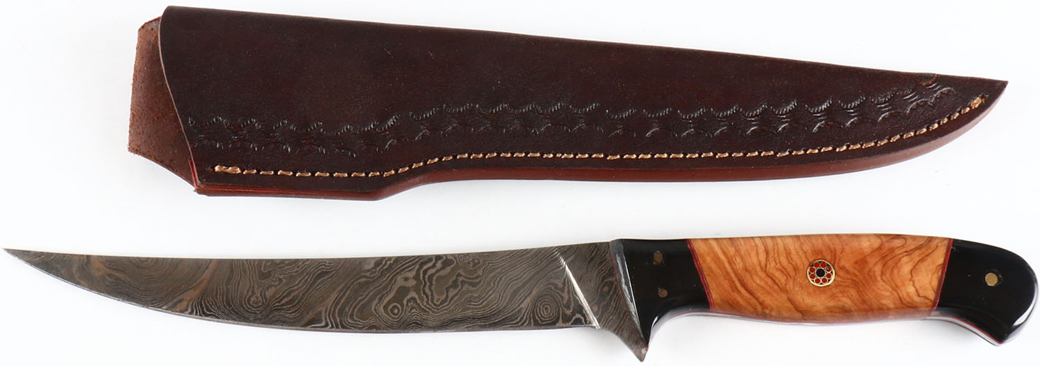 Unmarked fixed blade knife, 7'' damascus blade, has leather sheath, beautiful handle, blade has some rust. Grade: Excellent - Value: 20 to 80