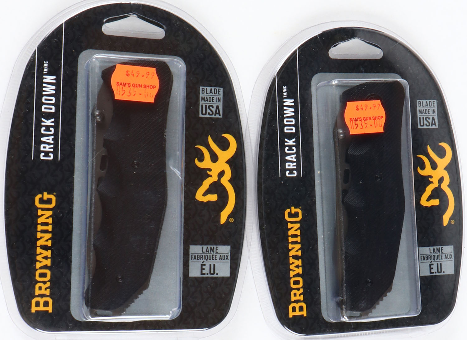 Lot of 2 Browning folding knives, in orginal packaging, ''Crack Down''. Grade: MINT - Value: 40 to 80