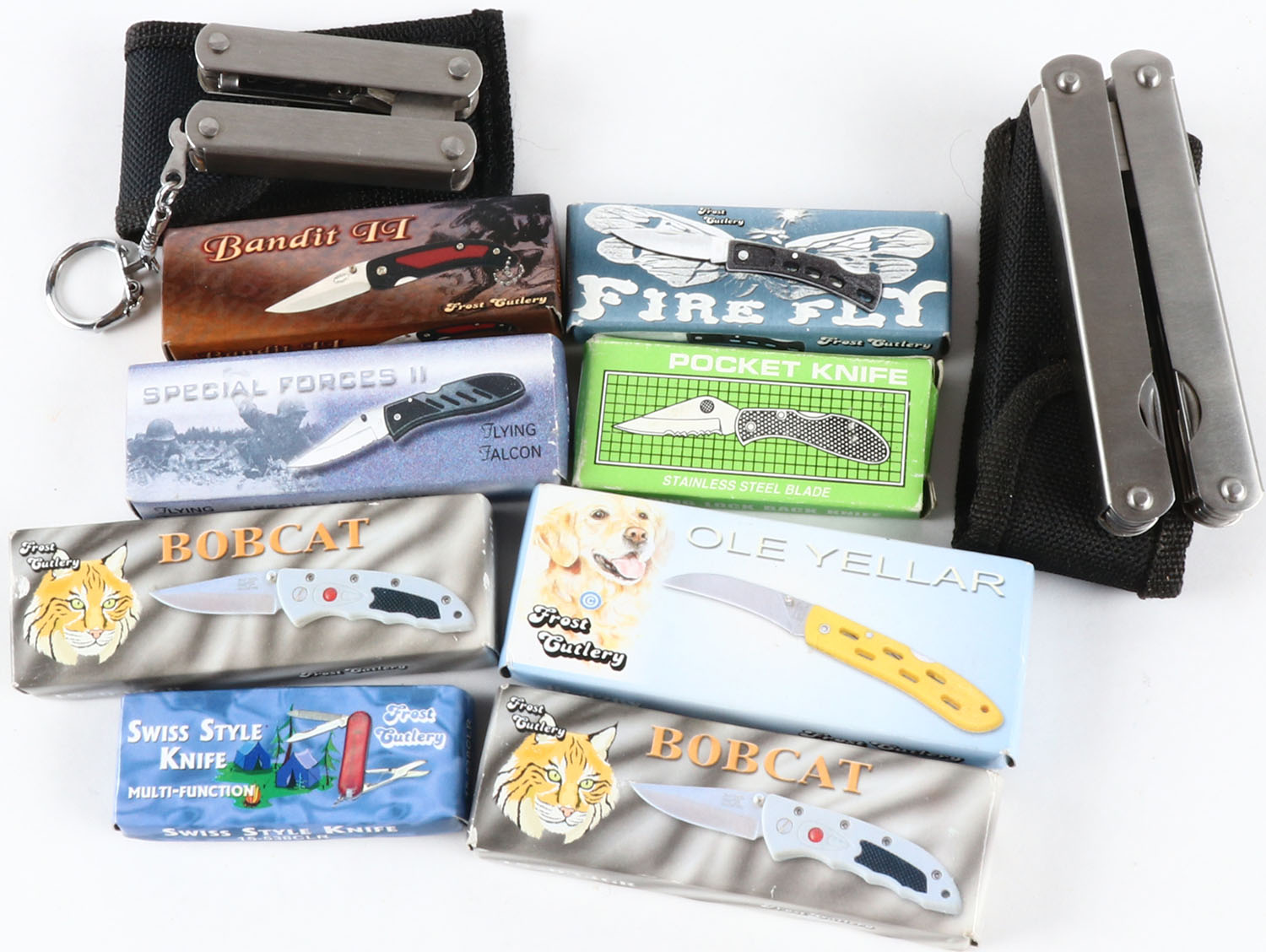 Large lot of folding knives, in original boxes. Grade: Excellent - Value: 6 to 60