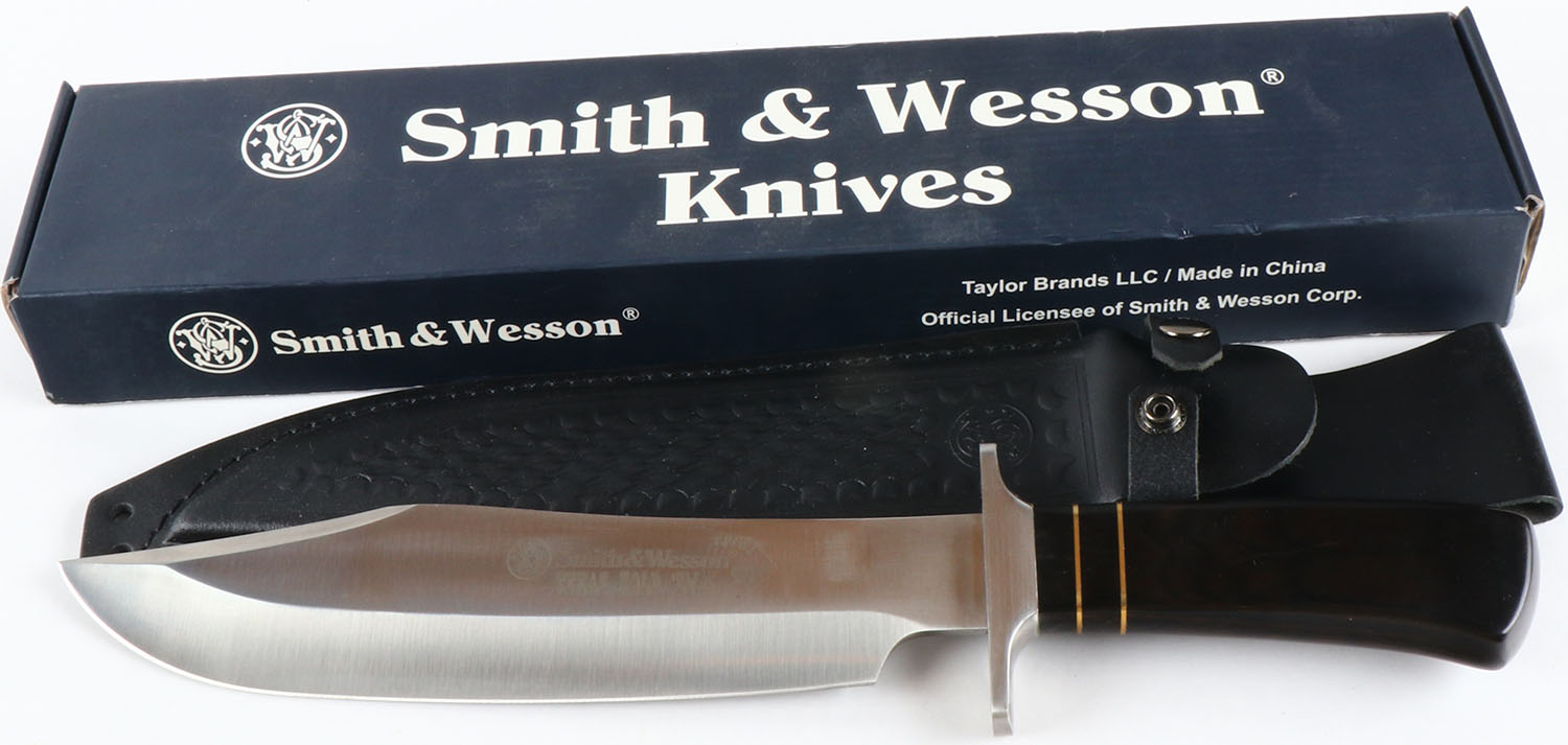 LARGE S&W Texas Hold 'em knife, 10'' blade, with sheath and original box, Limited Issue, all bright and clean. Grade: Excellent ++ - Value: 50 to 150