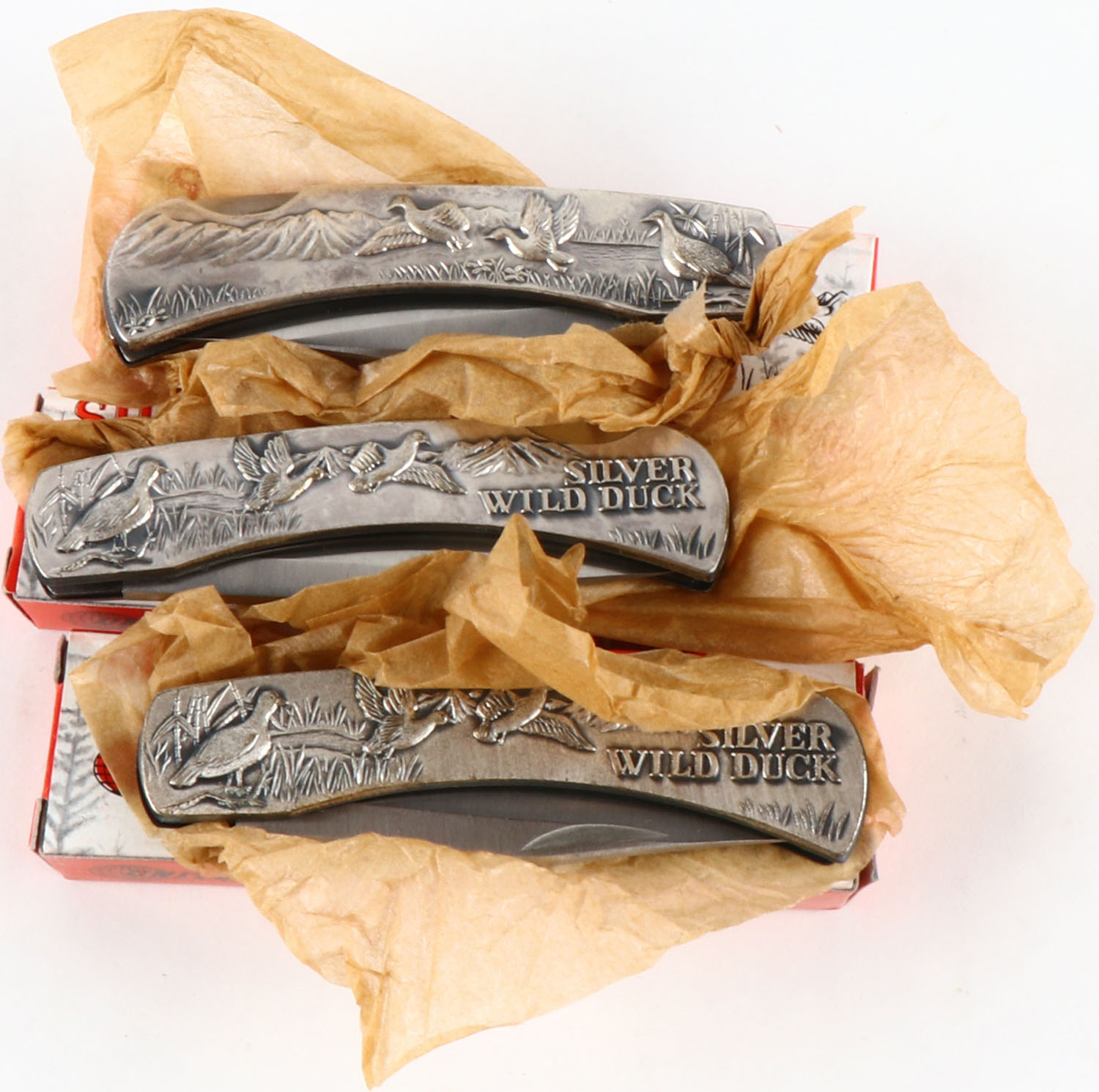 Lot of 3 Silver Duck folding knives, in orginal boxes. Grade: Excellent - Value: 10 to 50