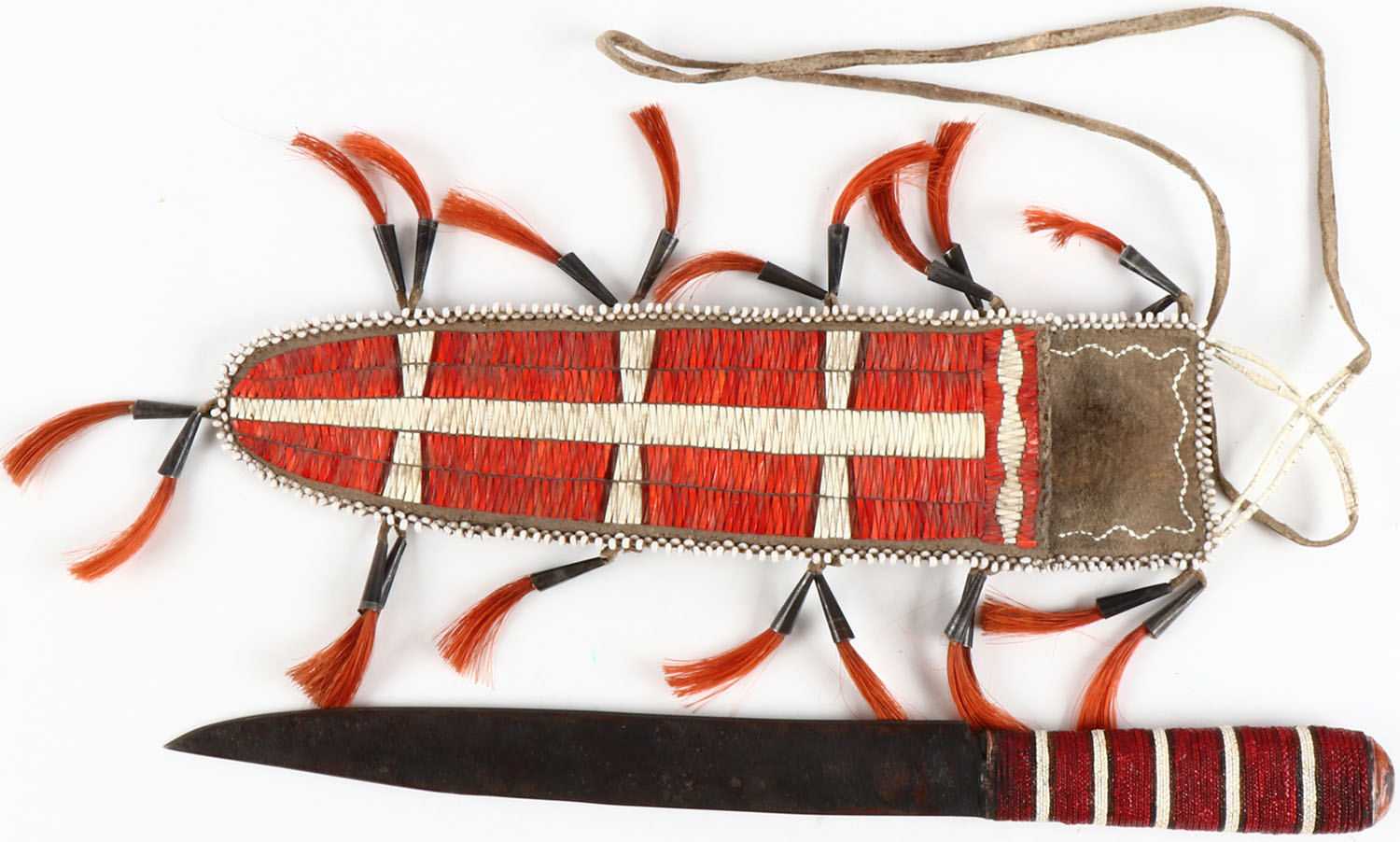 RARE Native Americans knife with sheath, 9'' blade, red and white design to handle of knife and the sheath has intricate design with metal cones and horse hair. Grade: Very Good - Value: 50 to 300