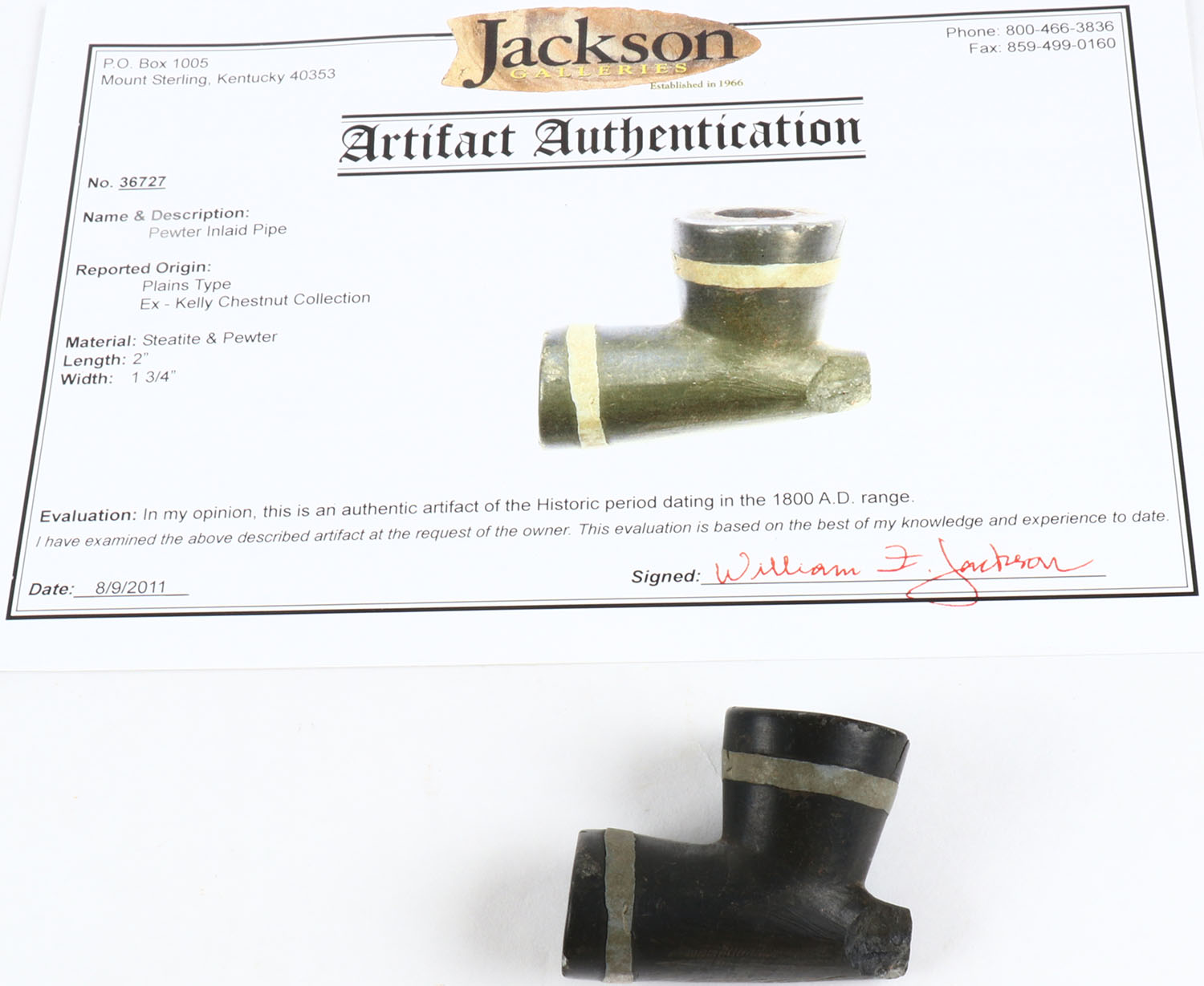RARE! Native American Plains pipe, steatite and Pewter pipe, with Artifact authentication from Jackson Galleries in 2011. Grade: Very Good - Value: 50 to 500