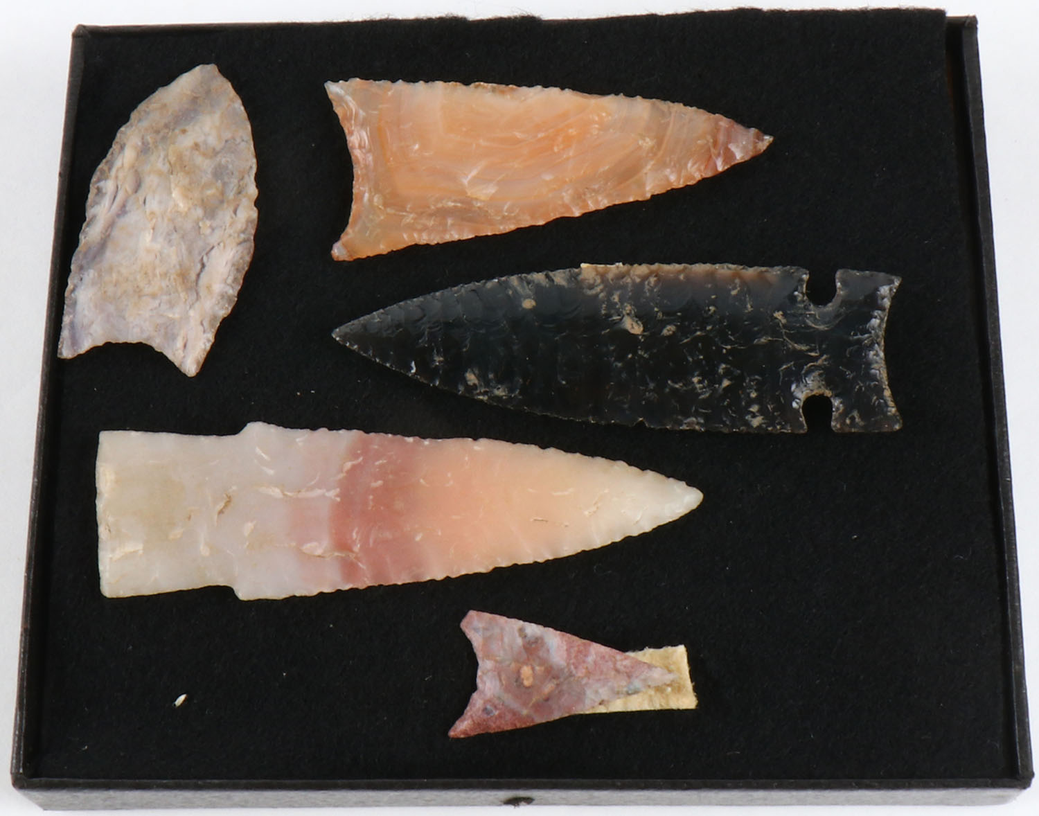 Lot of 5 gem quality Paleo spear points under glass, museum grade from the late E.E. Dorssom estate. Grade: Excellent ++ - Value: 100 to 600