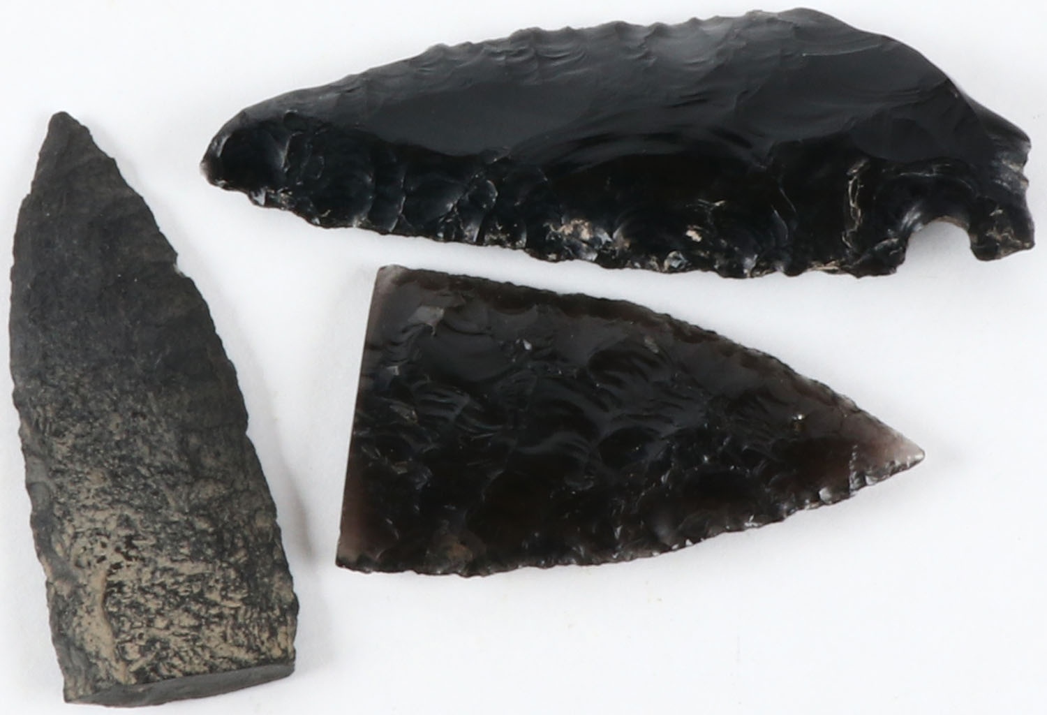 Lot of 3, 2 arrow heads and 1 spear point, 2 are obsidian 1 is a regular stone. Grade: Very Good - Value: 10 to 50