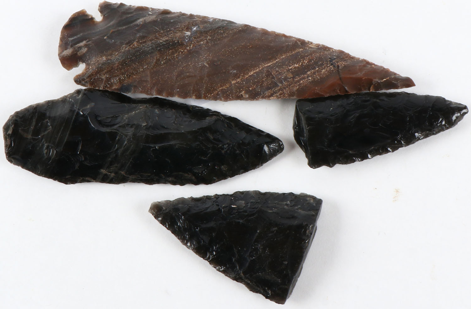 Lot of 4 spear tips, 3 are obsidian and the largest one is 6'' stone spear tip. Grade: Excellent - Value: 50 to 150