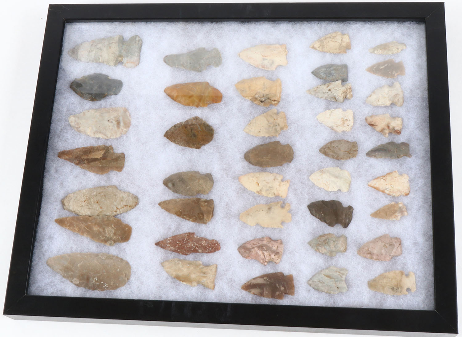 Very large lot of 40 Antique Native American arrow heads, various shapes, framed in glass, 15'' x 12''. Grade: Very Good ++ - Value: 100 to 300