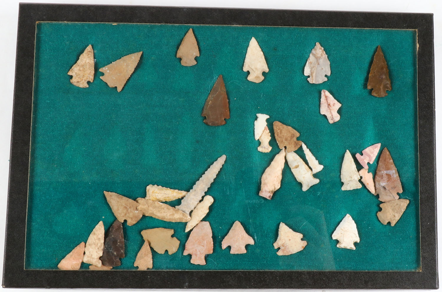 Large lot of Antique Native American arrow heads, various shapes, framed in glass, 12 1/2'' x 8''. Grade: Very Good ++ - Value: 50 to 200