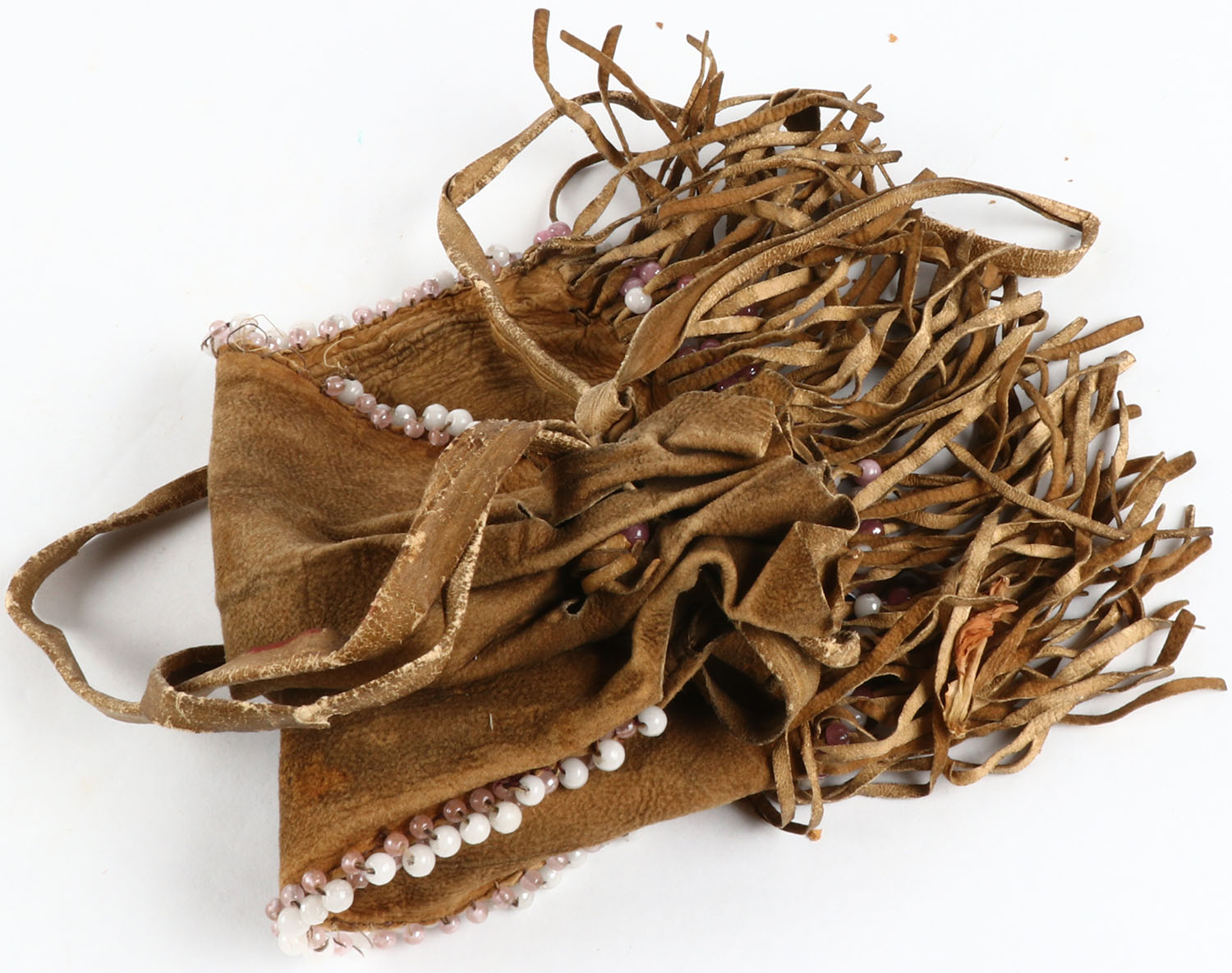 Plain Native American beaded tobacco pouch, circa 1890's, remnants of tobacco, minor bead loss, lots of fringe, 13'' OAL. Grade: Very Good ++ - Value: 50 to 500