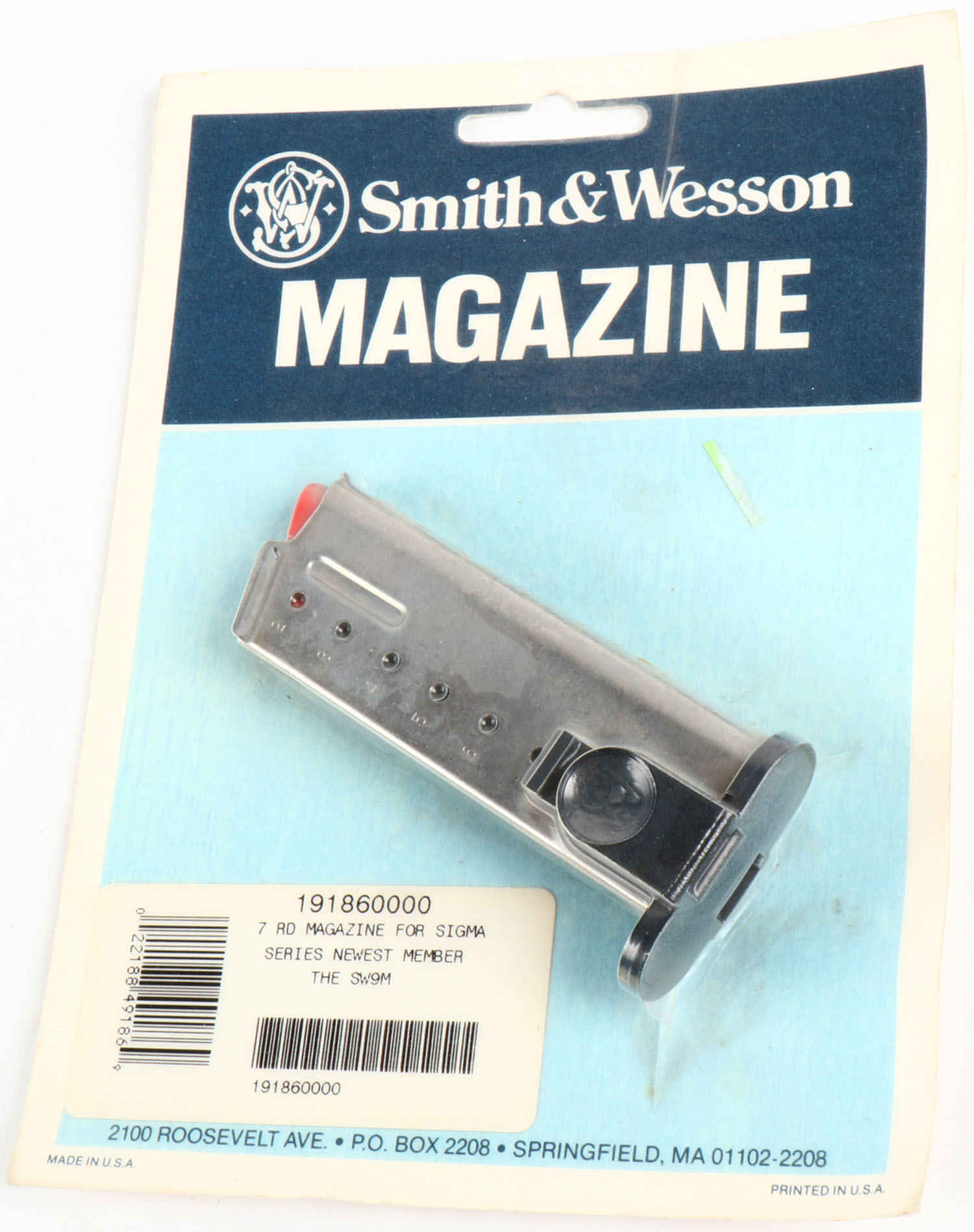 S&W sigma mag. 7 rd. pistol mag., 9mm in orginal case. Grade: Excellent - Value: 16 to 60