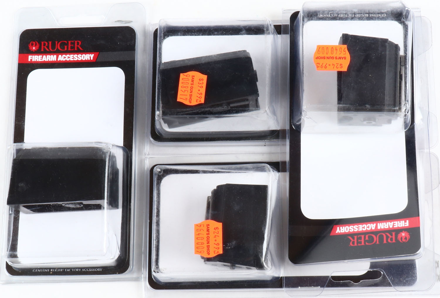 Lot of 4 Ruger mags., .17 WSM, (2) .22 mag/.17HMR and .22 Hornet, sealed in orginal packaging. Grade: MINT - Value: 20 to 80
