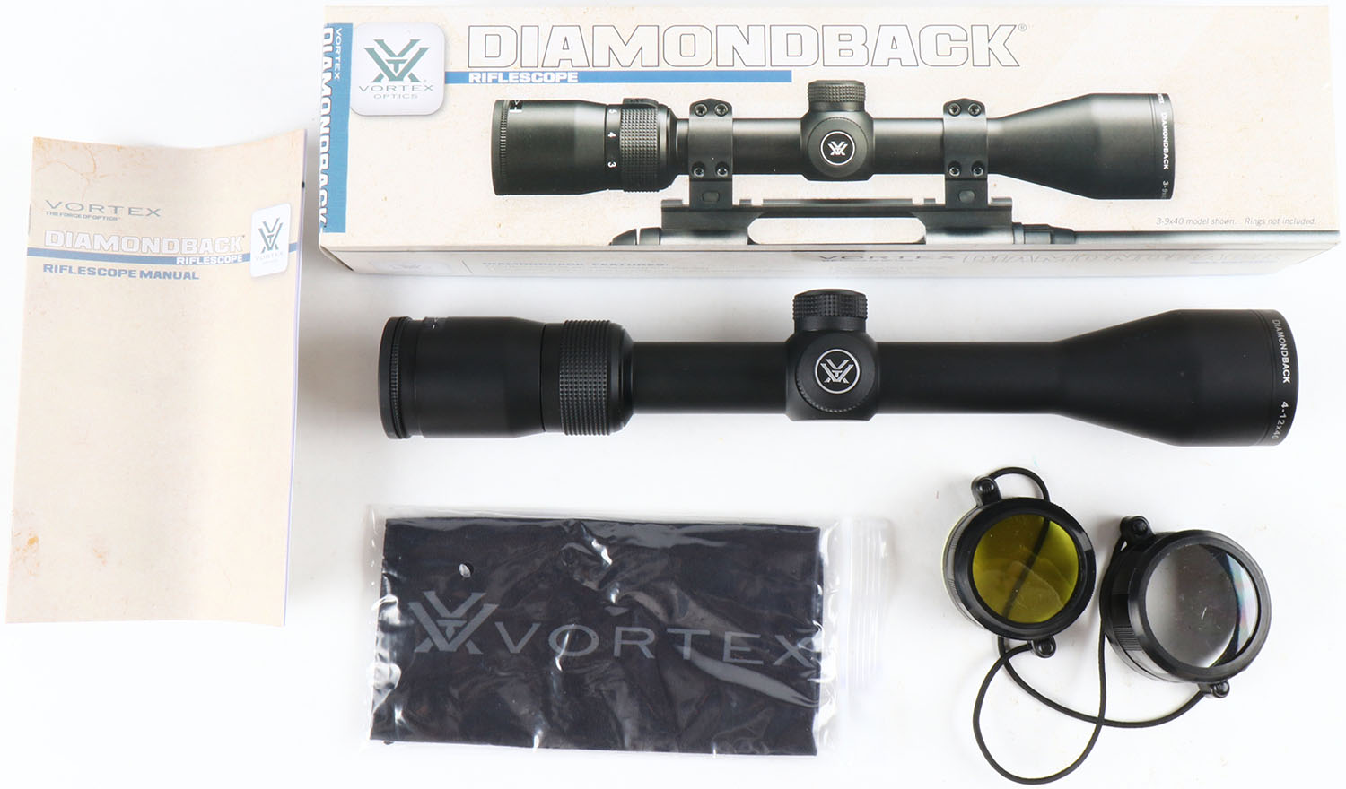 Vortex, Diamondback , 4-12 x 40mm, Variable Magnification Rifle Scope, NIB, 1 Inch Tube Diameter, Second Focal Plane Dead-Hold BDC (MOA) Reticle, Fixed Parallax, Fast Focus Eyepiece, Argon Gas Purged Aircraft Grade Aluminium Housing, Waterproof, Fog proof, Shock Proof, 12 Inches long, Low Height capped turrets have 60 MOA of internal adjustment for elevation and windage, clicks are somewhat audible and slightly mushy, 1/4 MOA Clicks, Fully Multi-Coated Filipino Glass, comes with Lens Covers, cleaning cloth, and Vortex's unbeatable Unconditional Lifetime Warranty. Gade: MINT - Value: 200 to 400