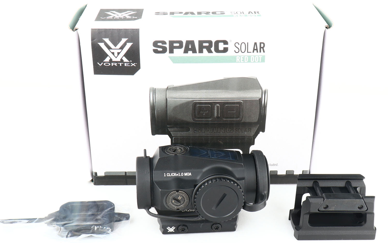 Vortex, SPARC Solar, 1x Magnification 2 MOA Bright red dot, 22mm Lens Diameter, 12 illumination settings as well as 2 night vision compatible settings, parallax free, 2 mounting options - low mount & lower 1/3 co-witness mount, 2.6 inches long, weighs 3.8 oz., unlimited eye relief, Motion activated (shake-awake), comes with tethered lens covers, a turret tool, 1 CR2032 battery, and lens cloth, flush turrets are 1 MOA per click, clicks are stiff and somewhat audible, dot is bright and crisp, fully muilti-coated chinese glass is clear and blemish free. Grade: MINT - Value: 100 to 400