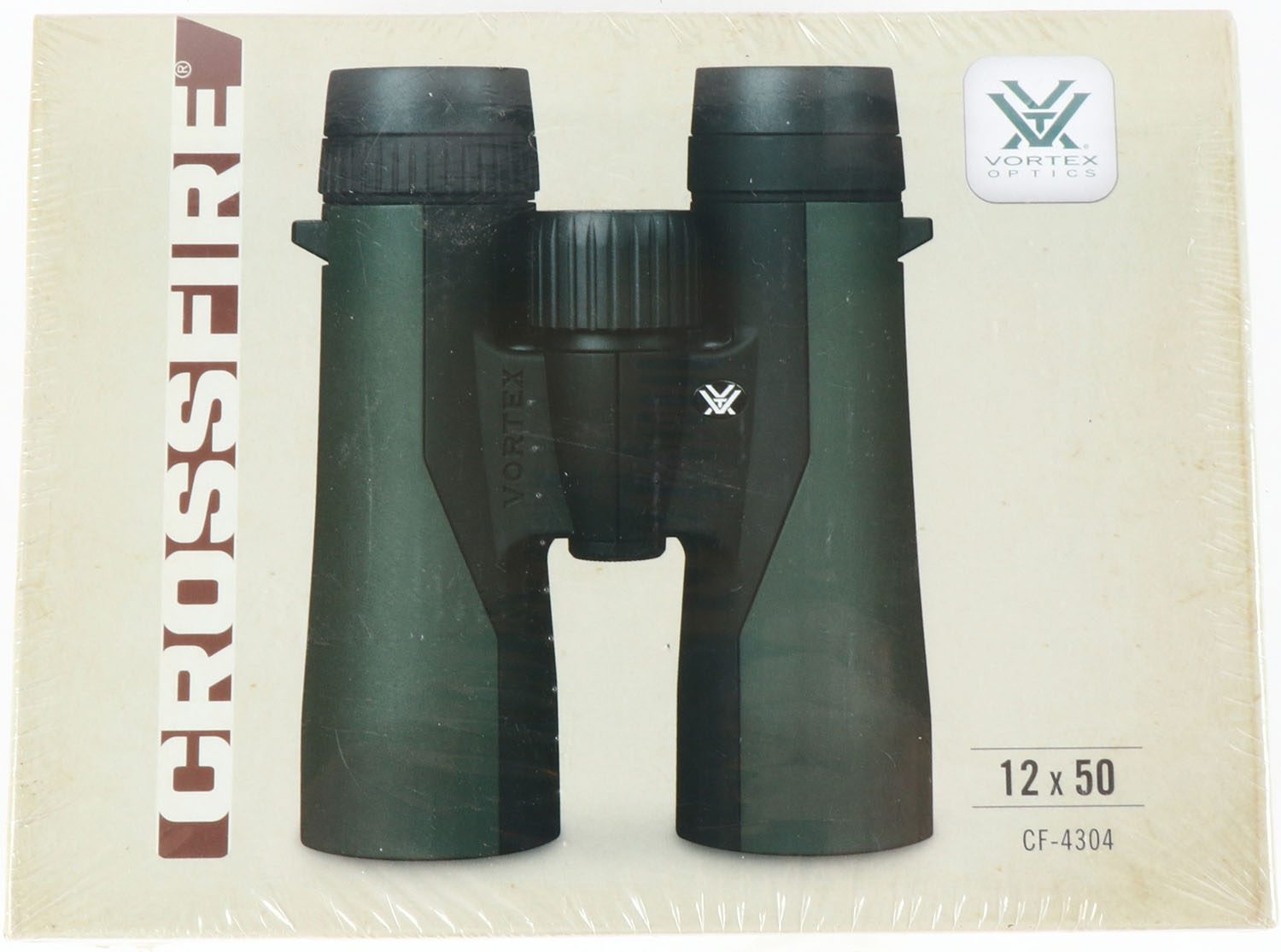 Vortex, Crossfire, 12x50 Binocular, SEALED NIB, comes with carrying case, neck strap, rain guard eyepiece cover, tethered lens covers, and lens cleaning cloth. Grade: MINT - Value: 100 to 300