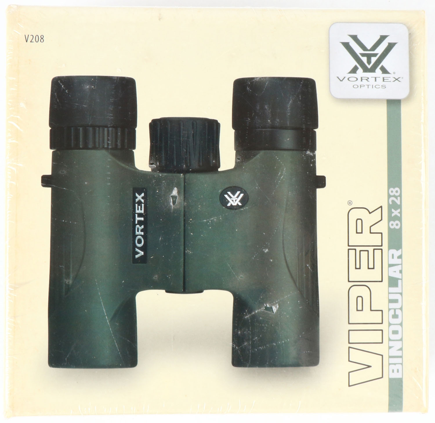 Vortex, Viper, 8x28 Binocular, SEALED NIB, comes with carrying case, neck strap, rain guard eyepiece cover, tethered lens covers, and lens cleaning cloth. Grade: MINT - Value: 100 to 300