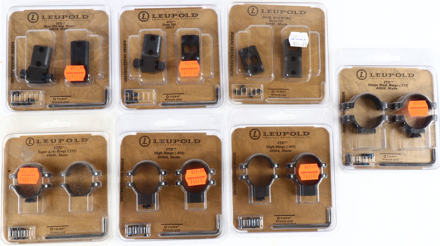 Lot of 7 Leupold mounts and scope rings, orginal packaging. Grade: MINT - Value: 10 to 50