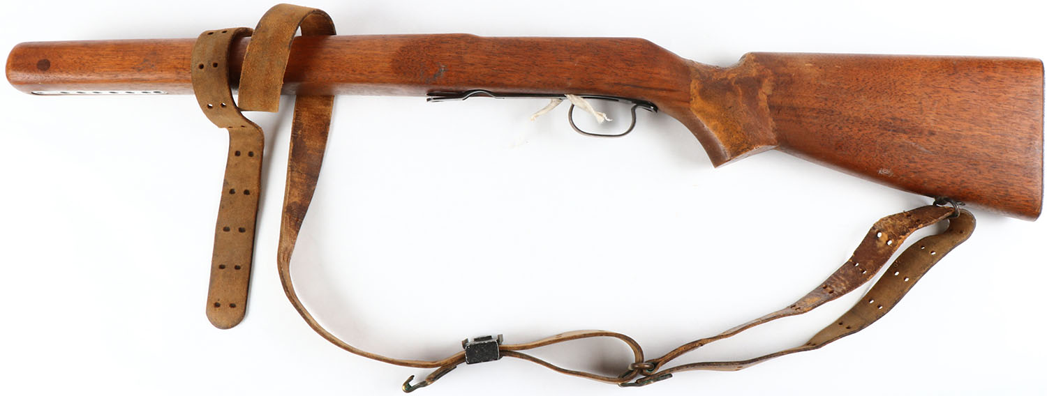 Wood rifle stock, no markings, 32'' OAL, has leather strap. Grade: Very Good - Value: 4 to 100