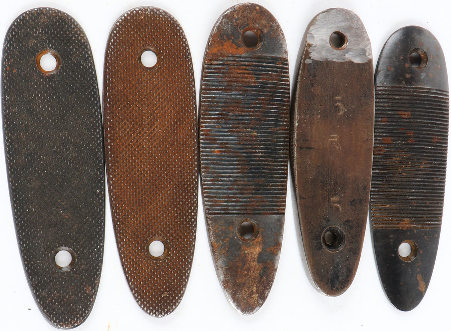 Lot of 5 metal buttplates. Grade: Very Good - Value: 10 to 50