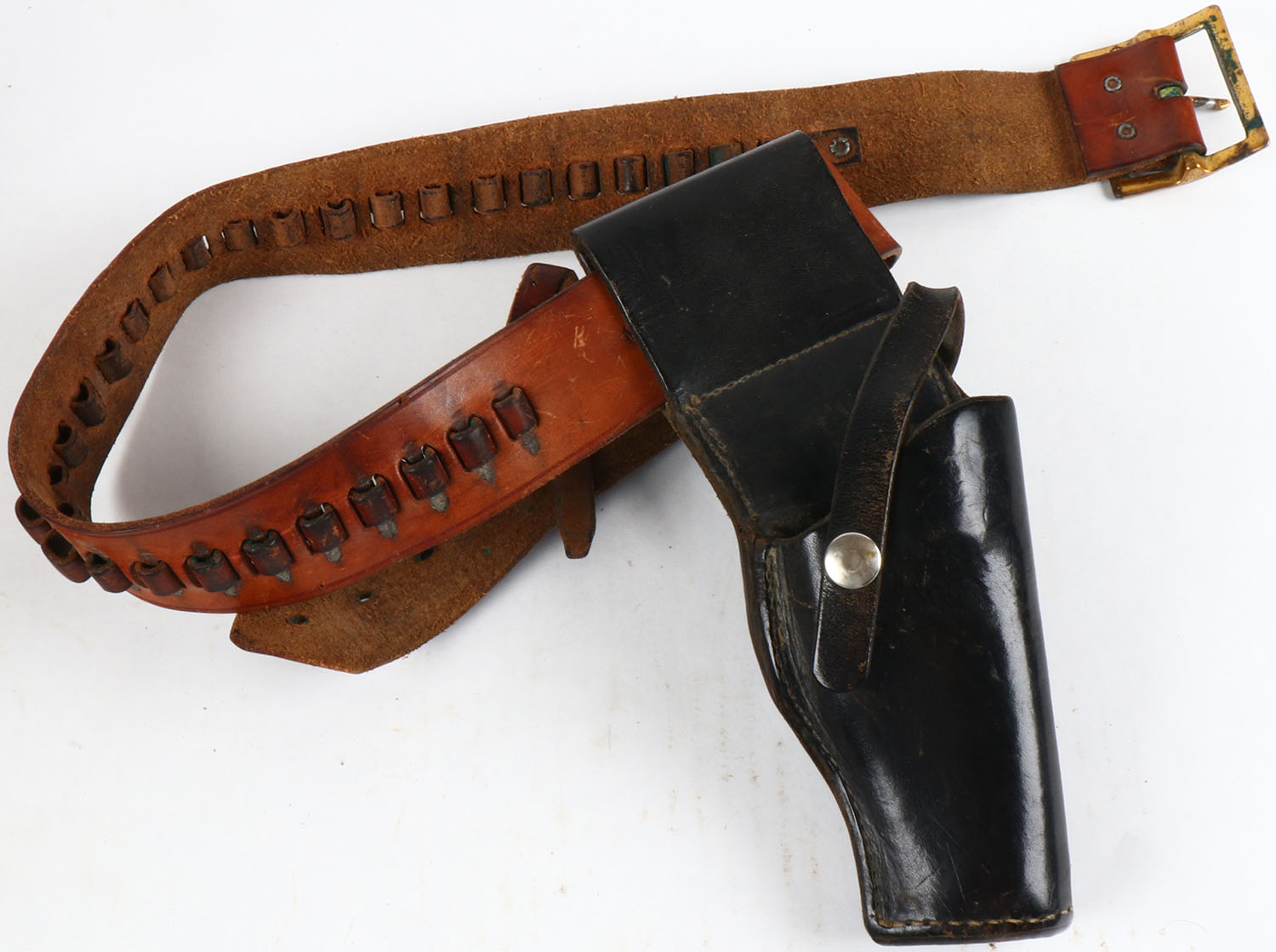 Leather holster & ammo belt for Colt Officer Police, holster is made by A.E. Nelson Salem OR (same company that made the rare fishing creels) belt is made by Warren, size 36-40. Grade: Excellent - Value: 20 to 100