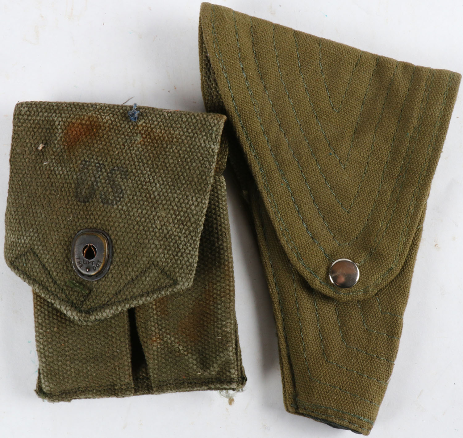 Lot of 2 army od green canvas holsters, one marked US. Grade: Excellent - Value: 2 to 30