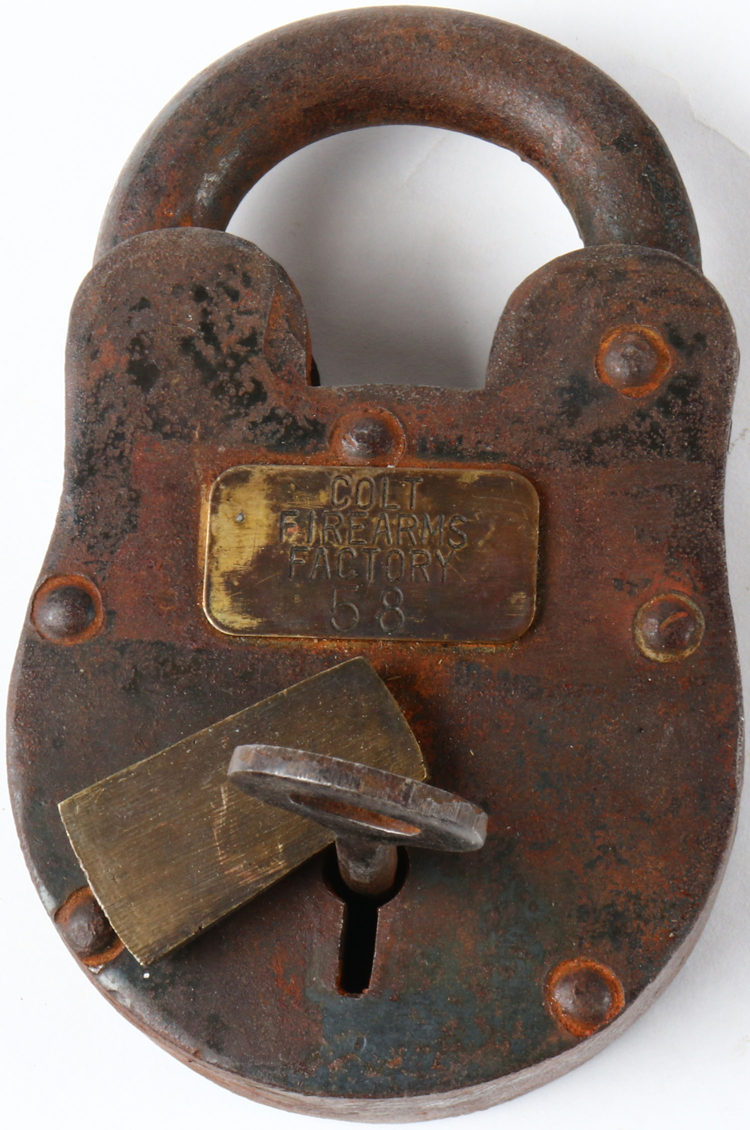 Colt Firearms Factory lock with key, marked 58, shows some rest. Grade: Very Good ++ - Value: 10 to 60