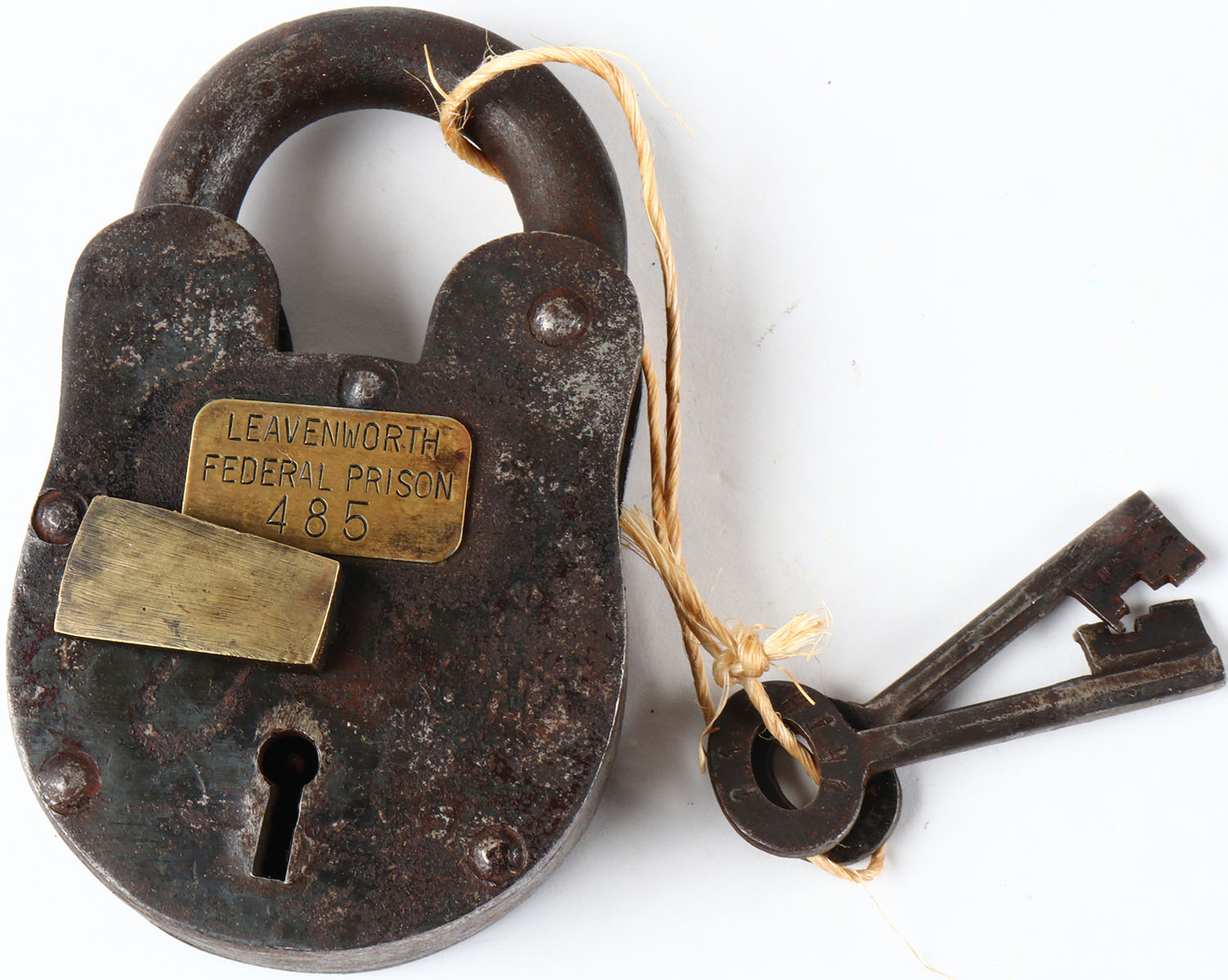 Leavenworth Federal Prison lock with key, marked 485, keys are marked ''11 Worth'' shows some rest. Grade: Very Good ++ - Value: 10 to 60