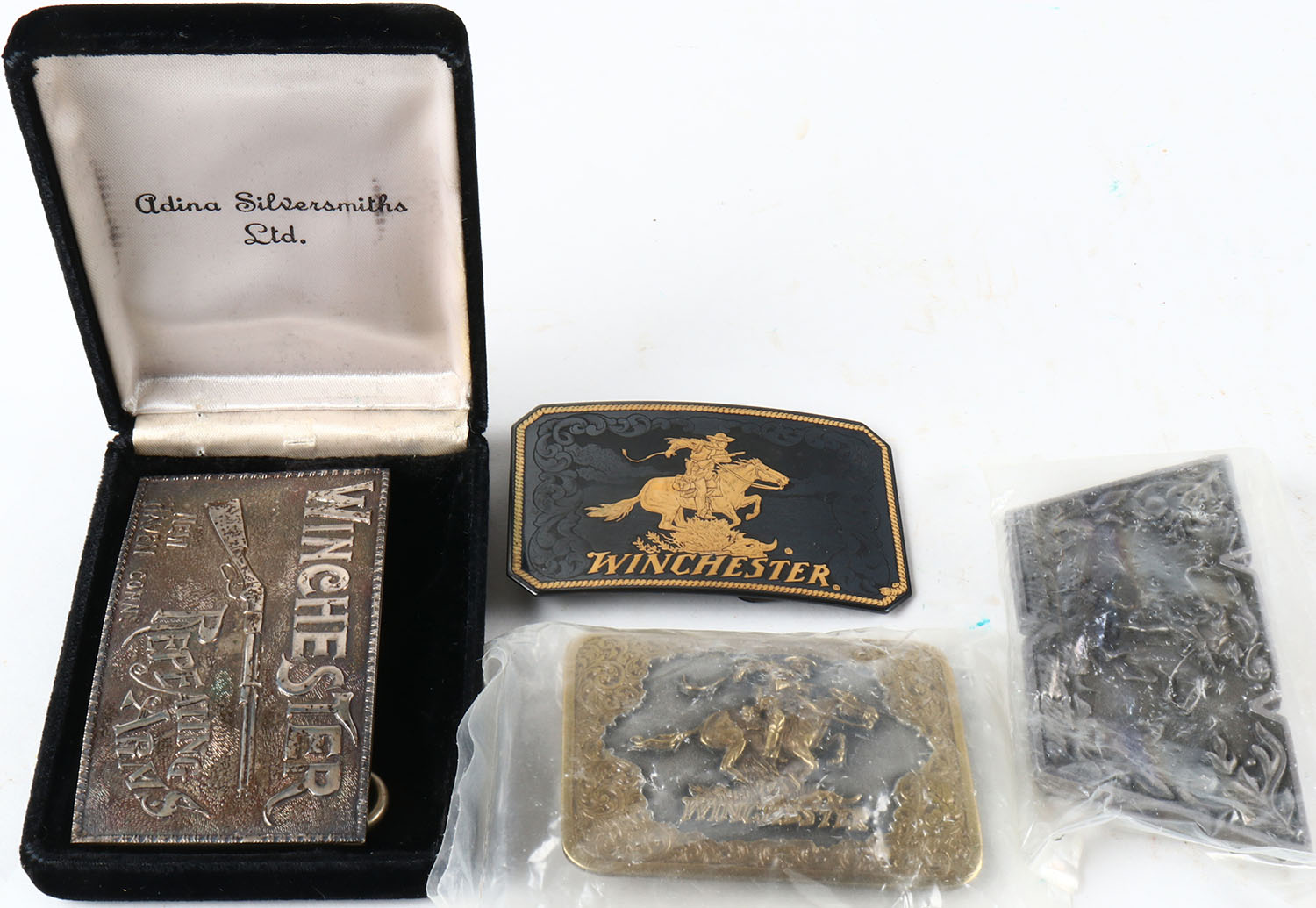 Lot of 4 Winchester Belt Buckles one in a case marked sterling silver. Grade: Excellent - Value: 10 to 60