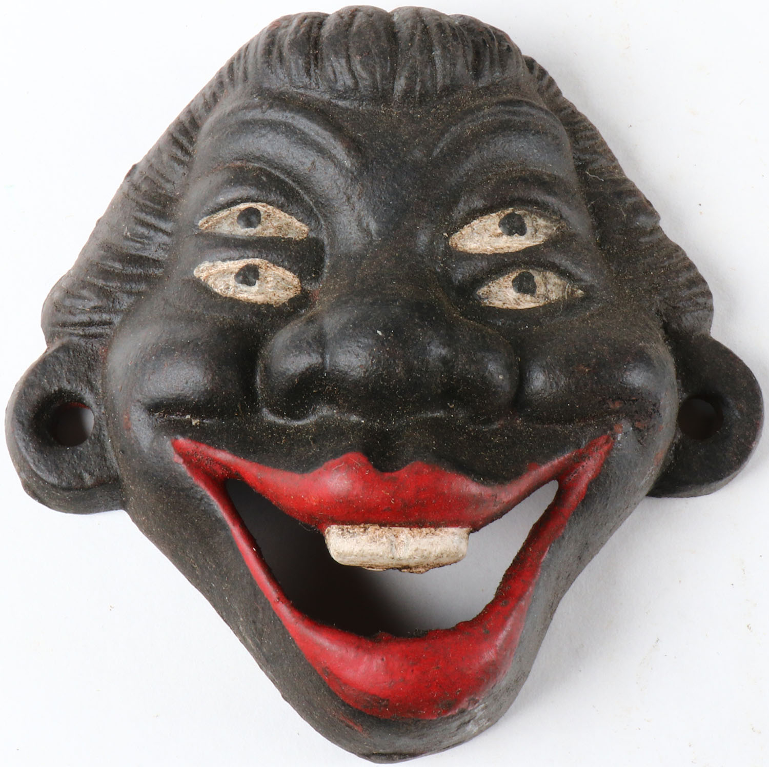 Four eye black sambo cast iron bottle opener, circa 1930, nice paint. Grade: Excellent - Value: 50 to 200