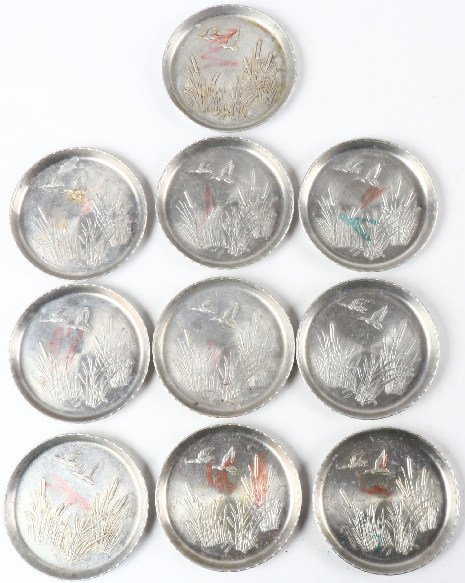 Lot of 10 vintage metal coasters with duck scenes. Grade: Excellent - Value: 10 to 50