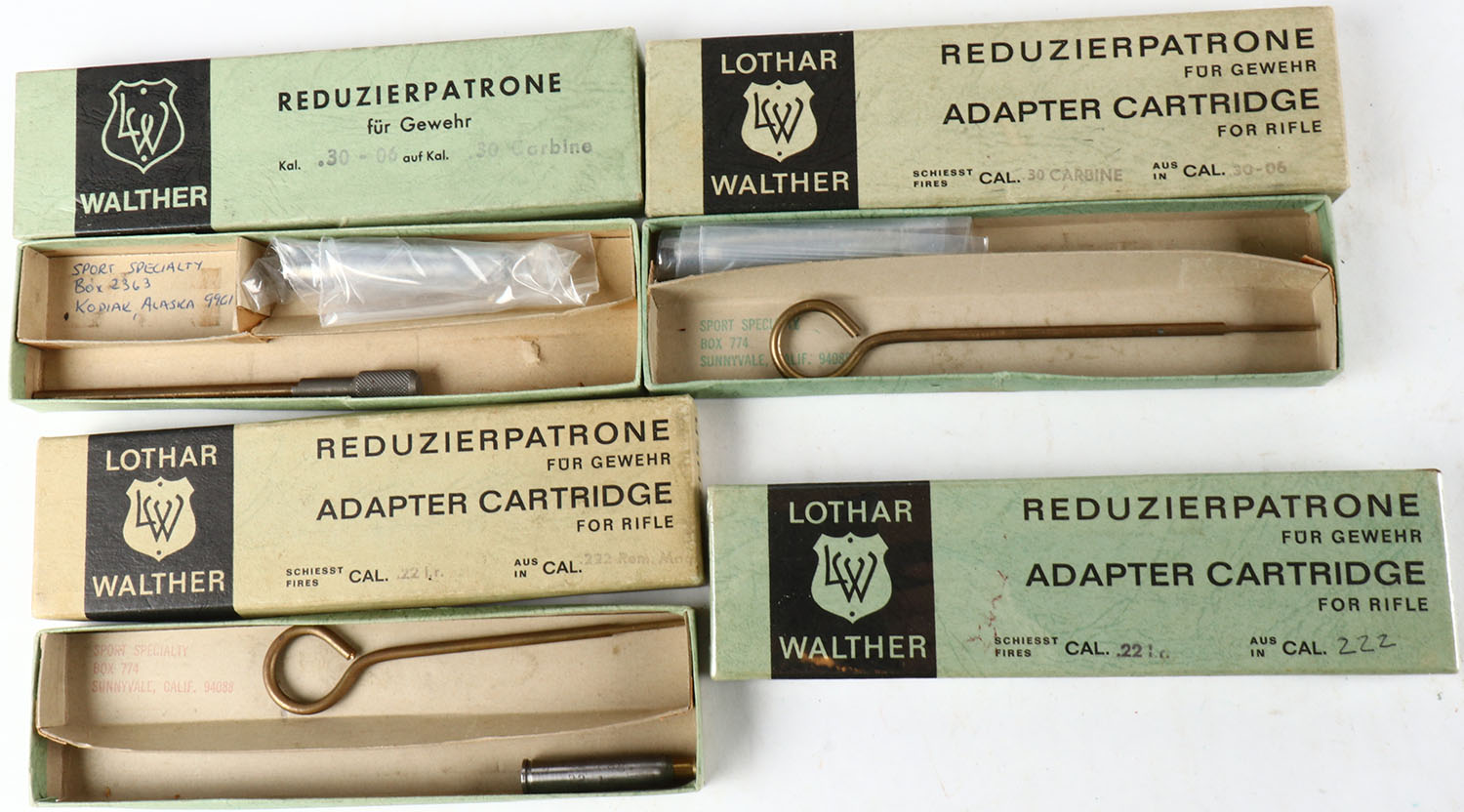 Lot of 4 Lothar Walther Cart adapter, 30 carb. To 30-06, 30-06 to .30 carb., and (2) .22 LR to .222 Rem Mag. Grade: Excellent - Value: 10 to 100