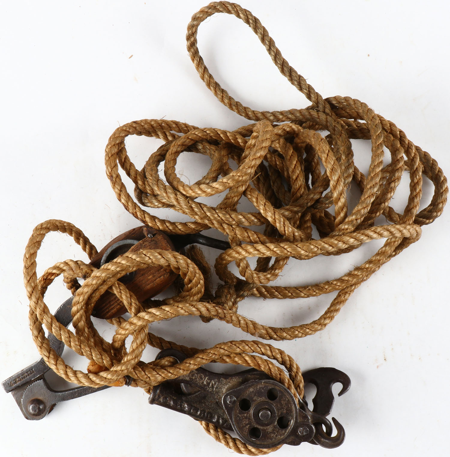 RARE! M. Klein signed cowboy barbed wire stretcher, Pat. 1887 on metal, iron and wood pulleys several stamped numbers. Grade: Excellent - Value: 50 to 350