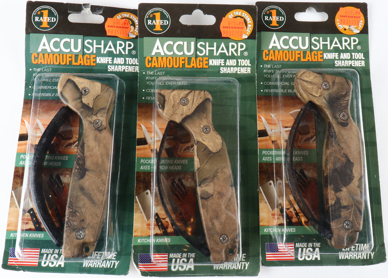 Lot of 3, Accu Sharp Camo knife & tool sharpener in original packages. Grade: MINT - Value: 10 to 40