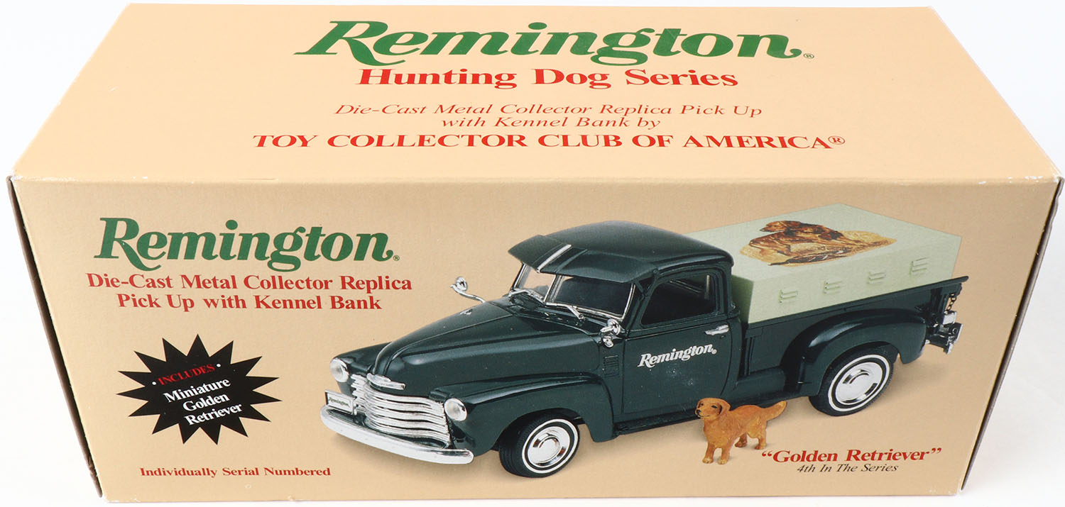 Remington truck, Golden Retriever, Hunting Dog Series, 4th truck in the series, in original box, NIB, very bright and clean. Grade: Excellent ++ - Value: 20 to 100