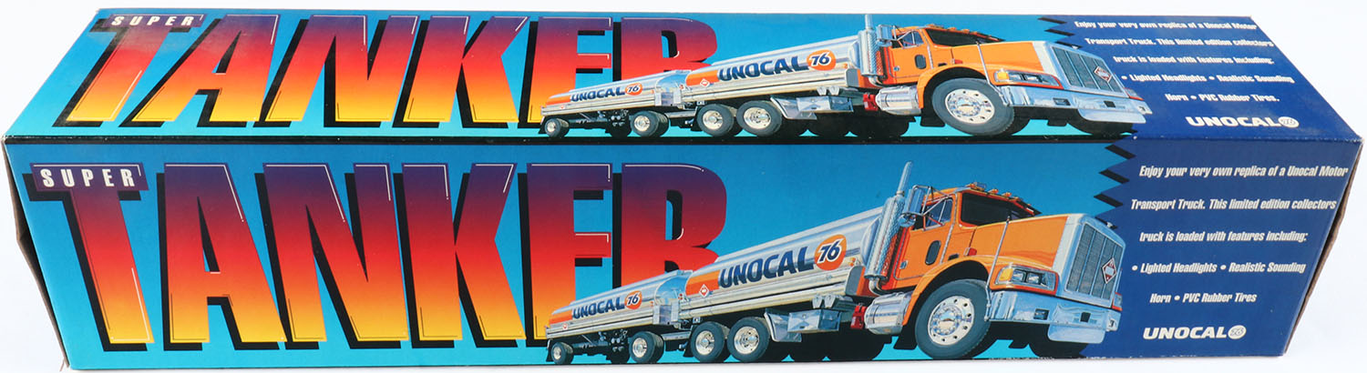 Unocal 76 Super Tanker in original box, has lighted headlights, realistic sounding horn, PVC tires 17'' long. Grade: Excellent ++ - Value: 2 to 100