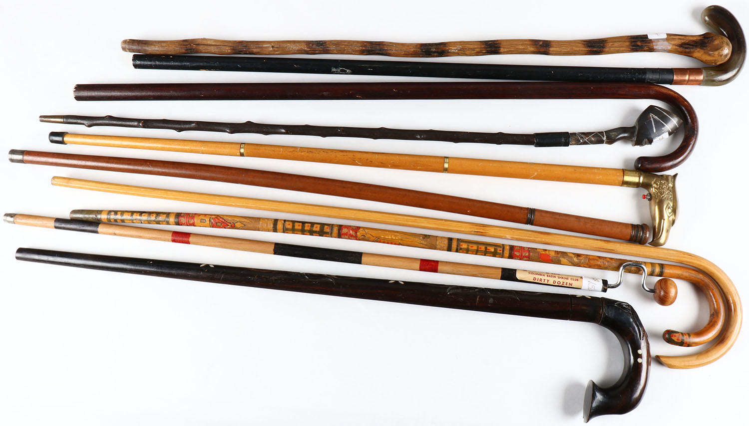 Large lot of walking canes, various styles all solid. Grade: Very Good ++ - Value: 10 to 200