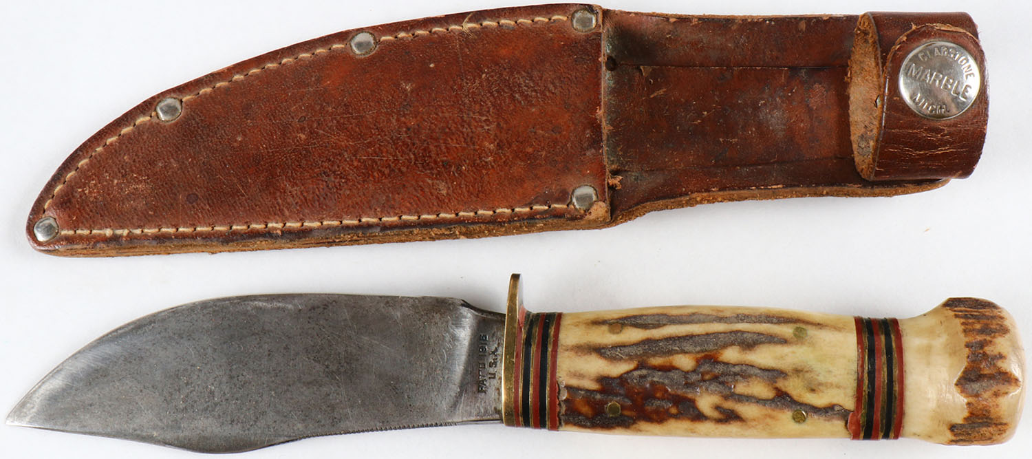Marble's Woodcraft 4 1/8'' blade, half hilt, stage grip, has marked sheath, circa 1916. Grade: Very Good + - Value: 50 to 250