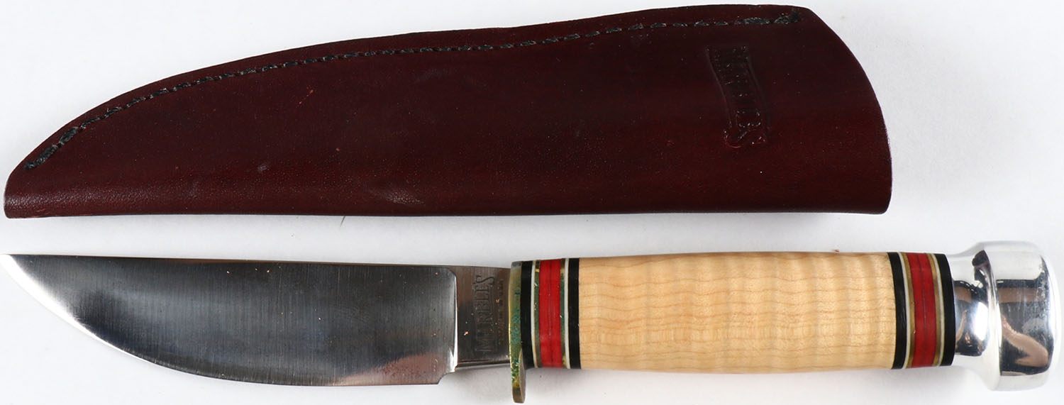 Marble's Knife, 4 1/2'' blade, half hilt, maple wood handle, circa 1997-2010m has marked sheath. Grade: MINT - Value: 30 to 100
