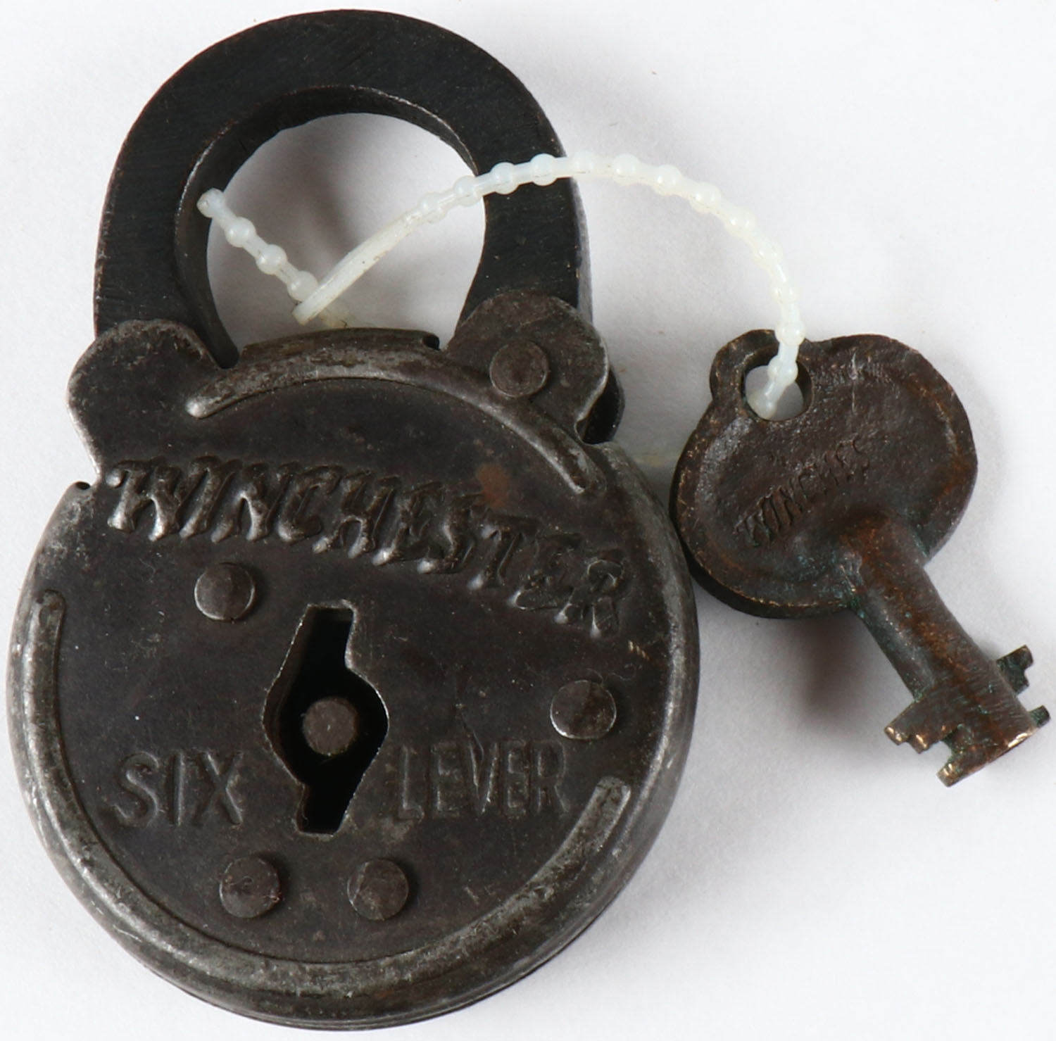 Winchester Six Lever pad lock with key, 2'' dia. Grade: Excellent - Value: 10 to 60