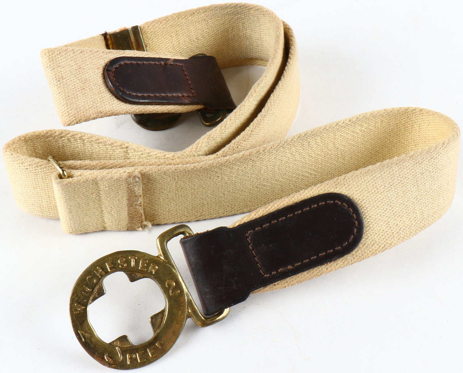 Winchester Belt, brass buckle is a large shot shell heat stamp, ''Winchester Super Speed No. 12''. Grade: Excellent - Value: 2 to 20