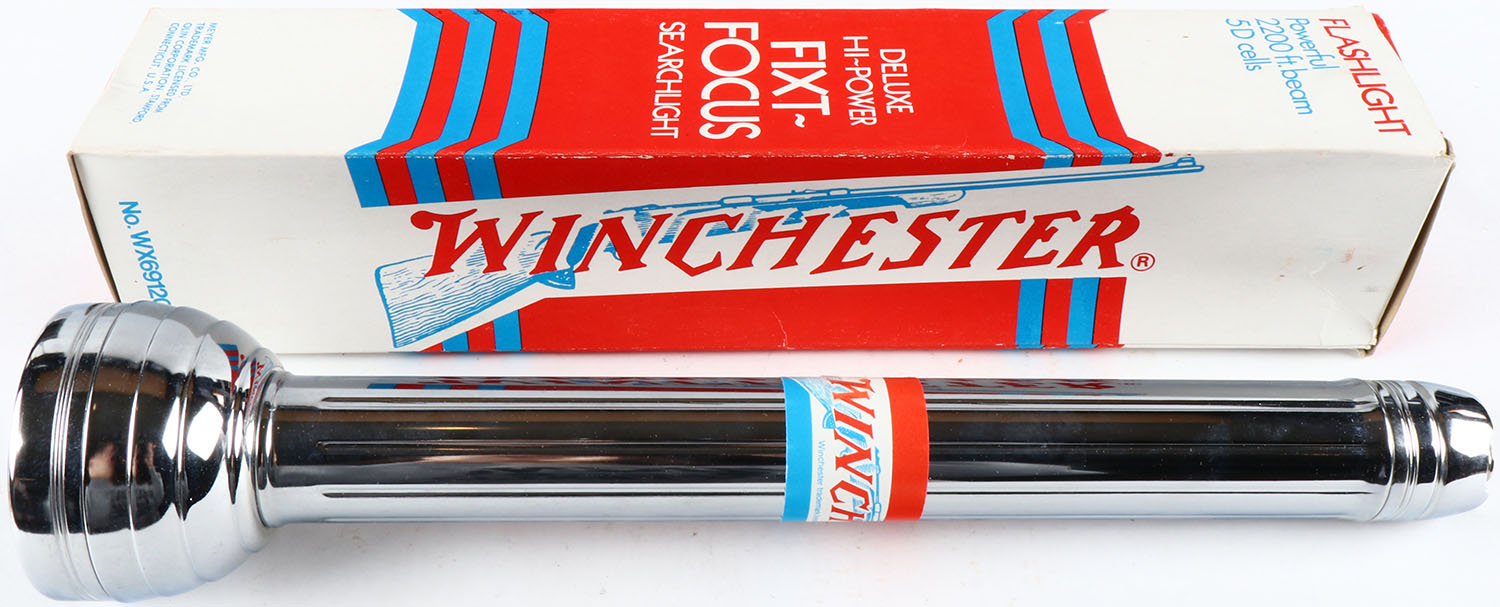 Winchester Deluxe Hi-Power Fixt Focus Search Light in orginal box, No. WX69120, 15'' long. Grade: MINT - Value: 6 to 30