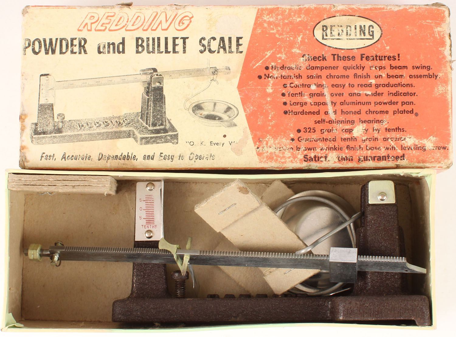 Redding Powder & Bullet Scale, in original box, box is solid with good to very good color, some age soiling, shelf wear, edge & corner wear, scale is minty. Grade: Excellent - Value: 20 to 100