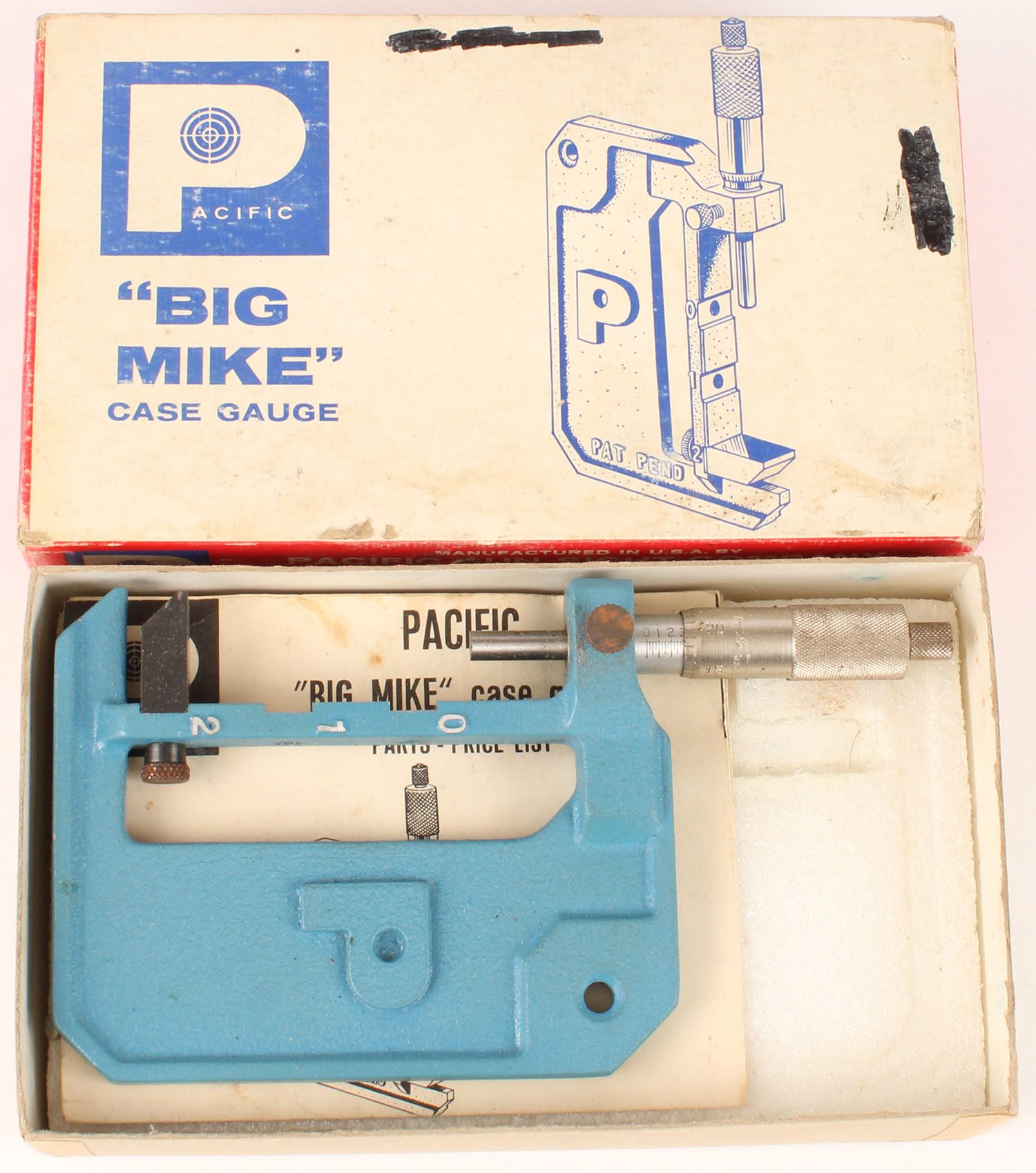 Pacific Gun Sight Company, ''Big Mike'' Case Gauge in original box, box is solid with very good color, some age soiling & corner wear, top has been written on, gauge is minty. Grade: Excellent - Value: 10 to 100