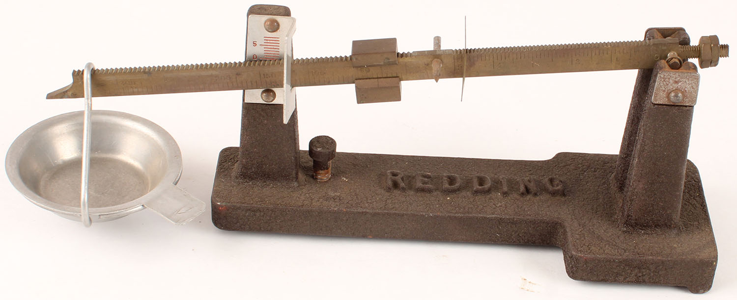 Redding Bullet & Powder Scale, No box, appears to have all pieces, very minor corrosion. Grade: Excellent - Value: 2 to 100