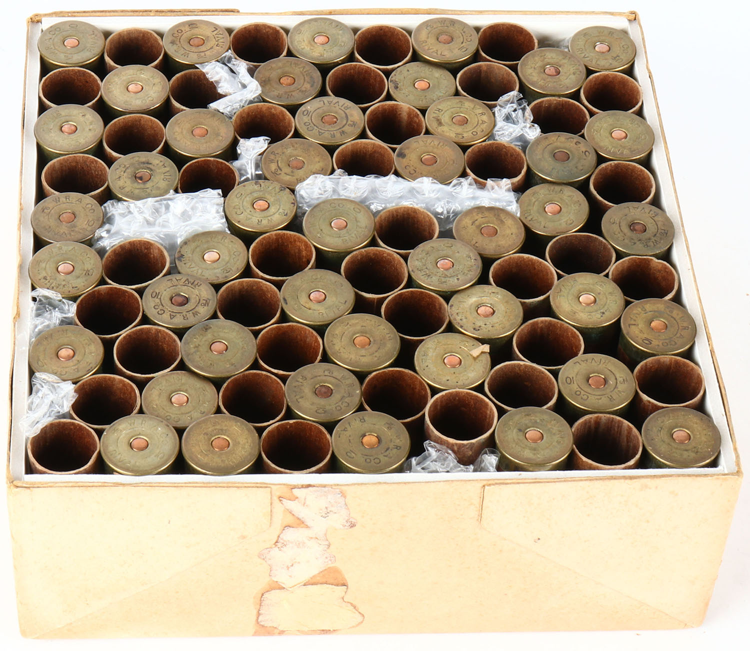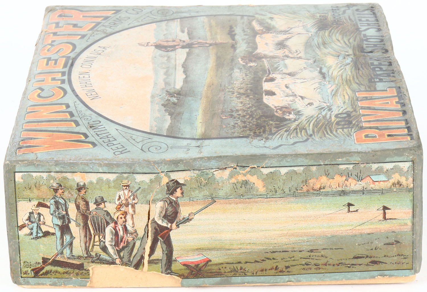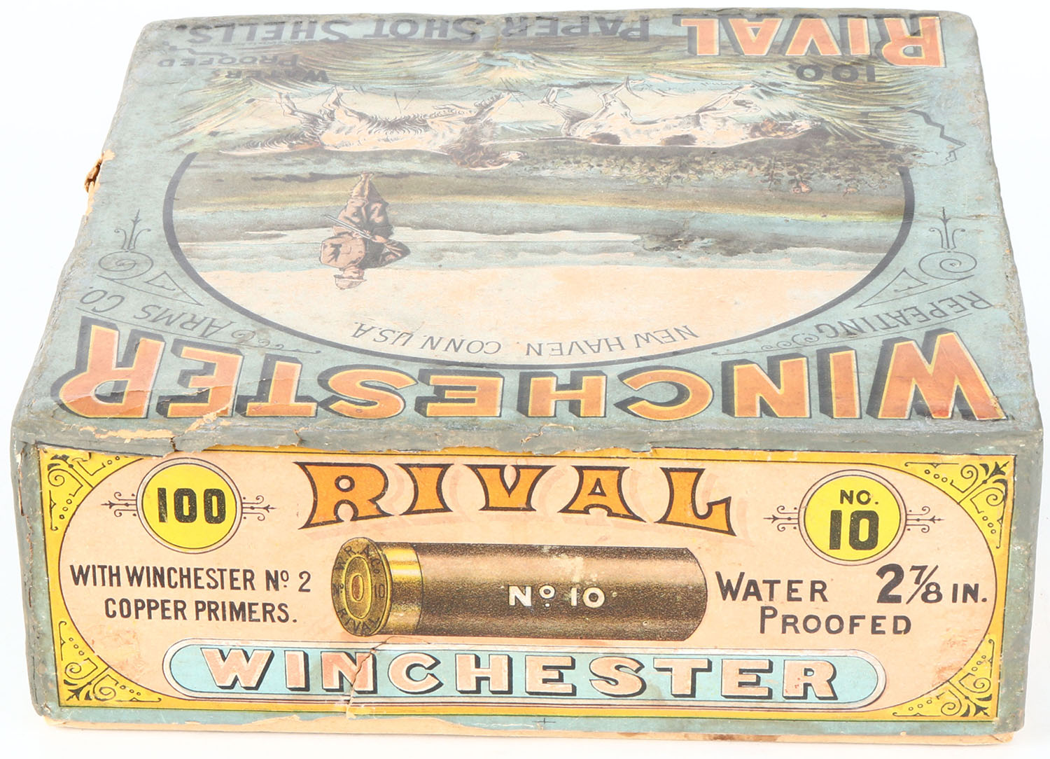Winchester Rival 100ct. Christmas Box, EXTREMELY RARE, 10ga, 2pc., 85% Partial of NPE, 2 7/8'', multi colored box with hunter and two dogs on top label, box has light soiling, light edge wear, some tears, & box has been professionally touched up on edges, Shells are good. Grade: Very Good ++ - Value: 8000 to 20000