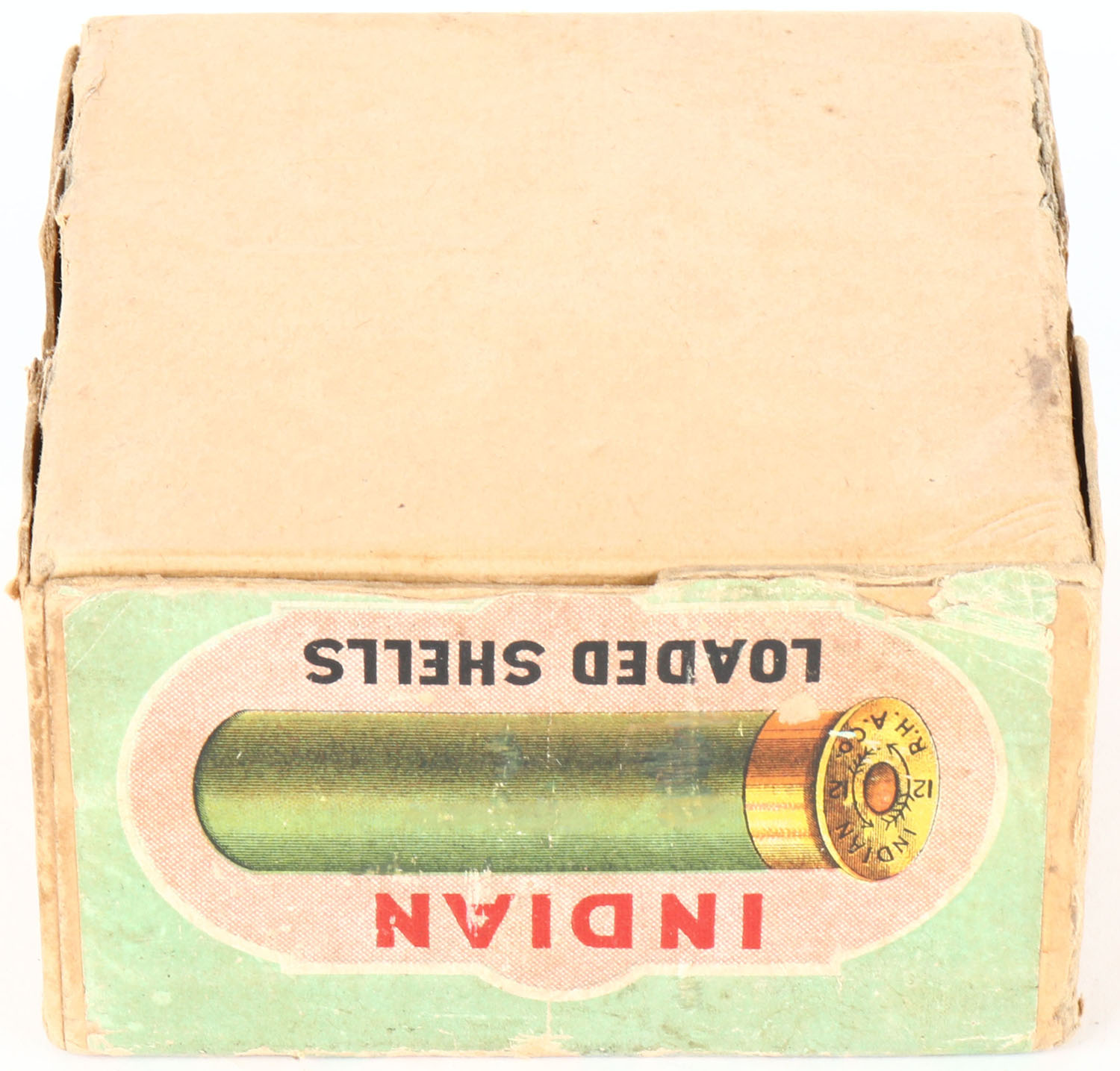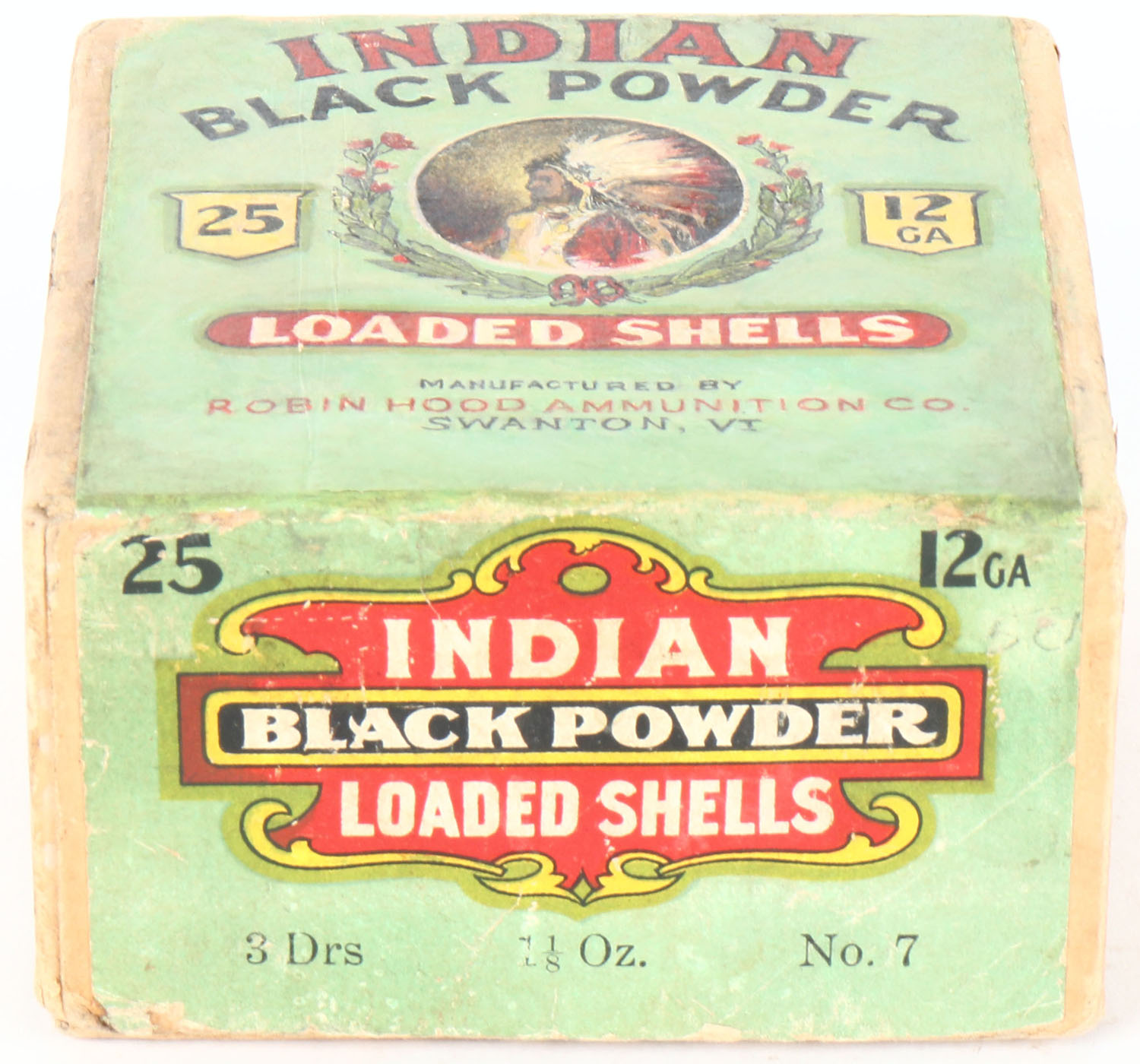Robin Hood Ammunition Co., INDIAN BLACK POWDER, 12ga., 2pc., Empty, shot size 7, buff box with green, red, white & black label that pictures a multi colored Chief in full head dress, Loading: 3 Drs. 1 1/8 Oz. No. 7, box has light soiling & edge wear. Label have been professionally touched up, VERY RARE BOX! Grade: Very Good ++ - Value: 1000 to 3000
