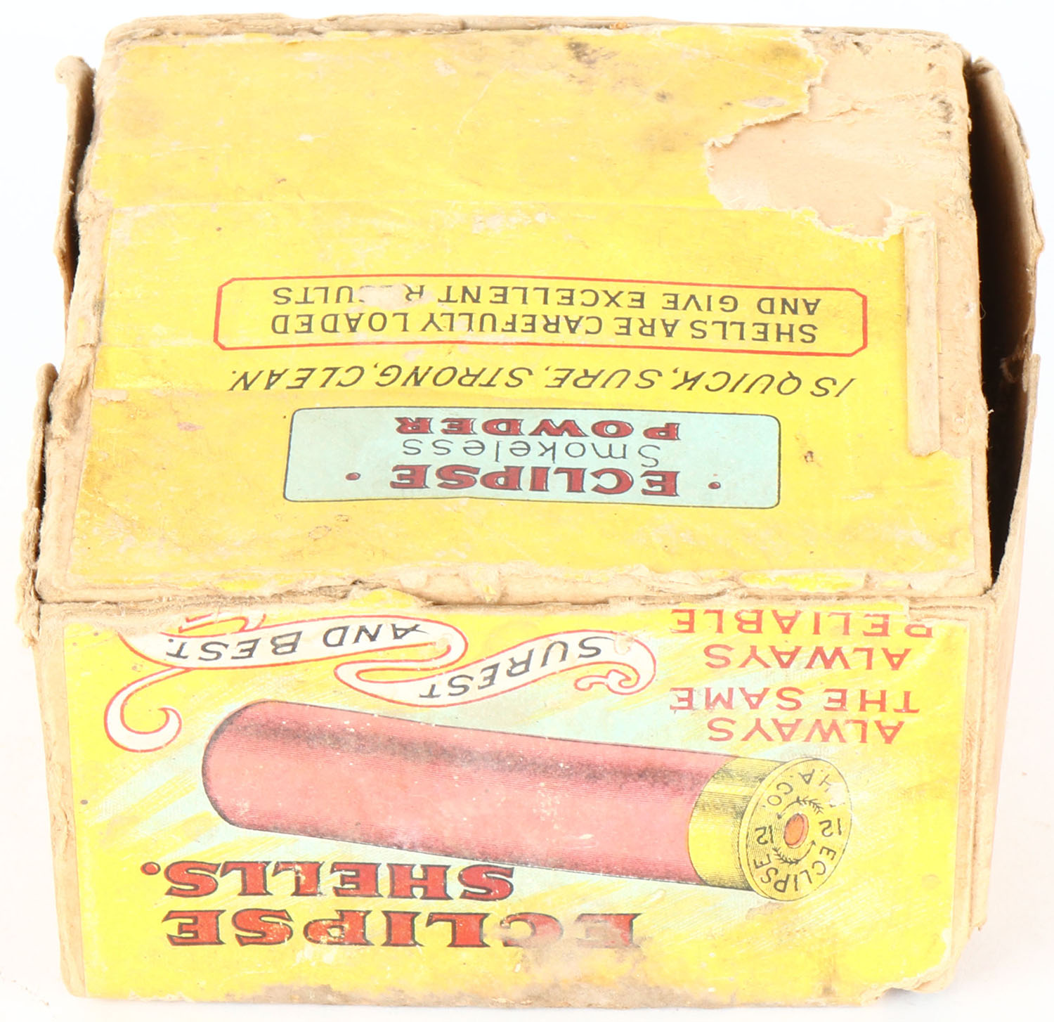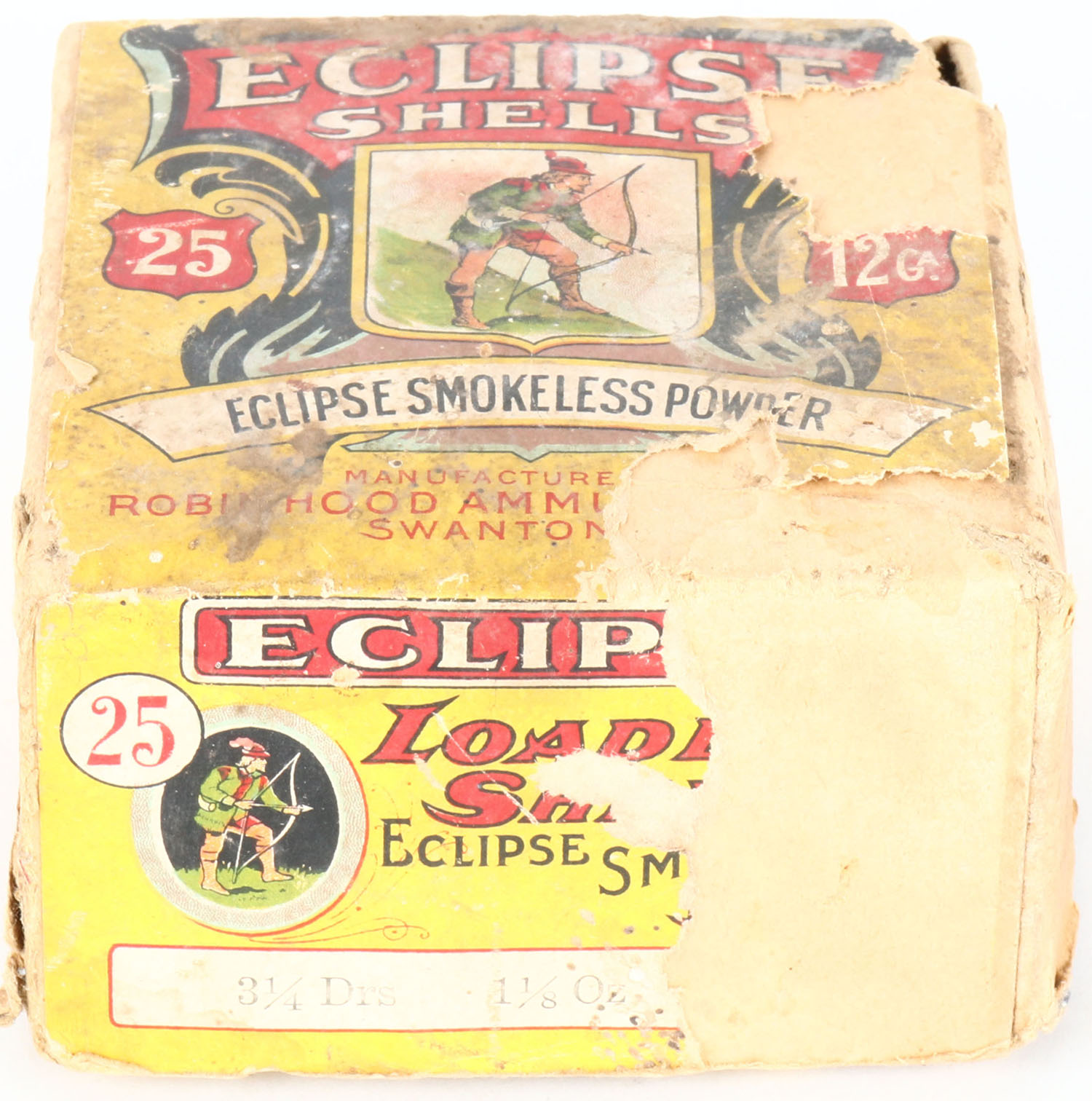 Robin Hood Ammunition Co., ECLIPSE, 12ga., 2pc., Empty, shot size Unknown, buff box with yellow, red, green, black & white label that pictures a multi colored Robin Hood, Loading: ECLIPSE SMOKELESS POWDER 3 1/4 drams, 1 1/8 Oz., box has soiling, scuffing, edge wear & tears, original label, Very hard to find box! Grade: Good + - Value: 250 to 750