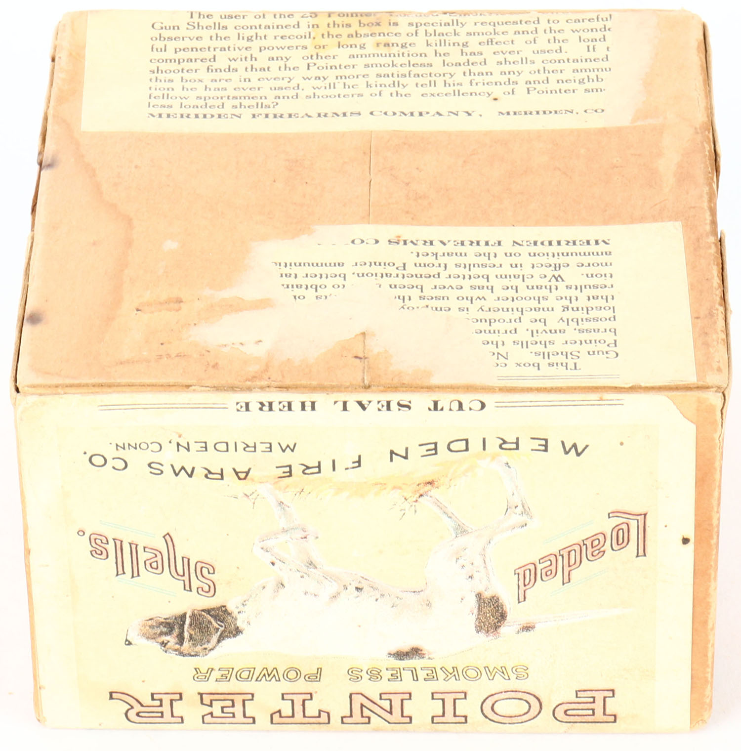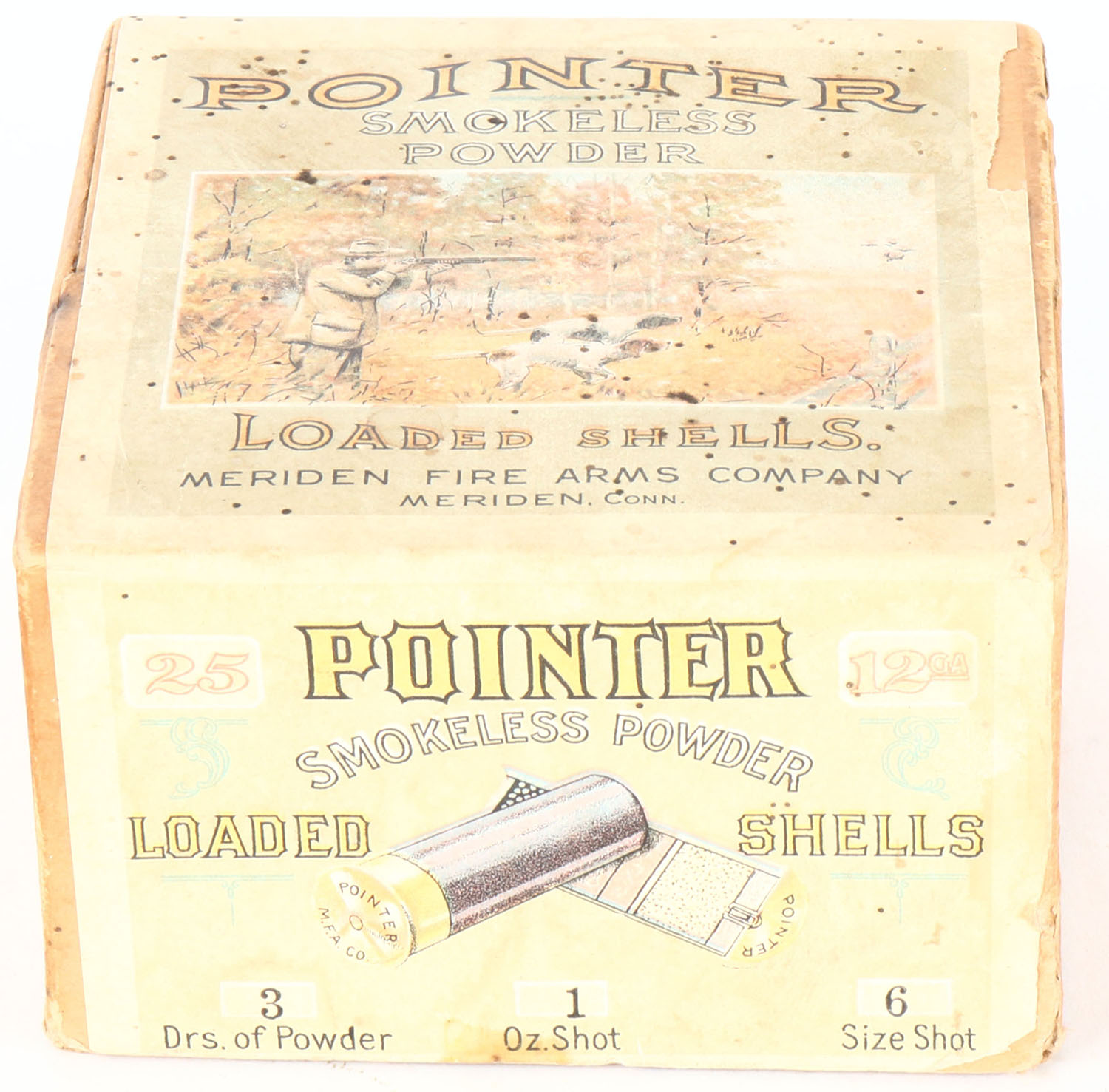 Meriden Firearms Co., POINTER, 12ga, 2pc., Empty, shot size 6 correct bottom, buff box with multi colored label pictures hunting scene on top, two crossed shells on one side & pointing dog on the other side, box has soiling & light scuffing, the label is 93% intact with great colors. Grade: Very Good ++ - Value: 100 to 500