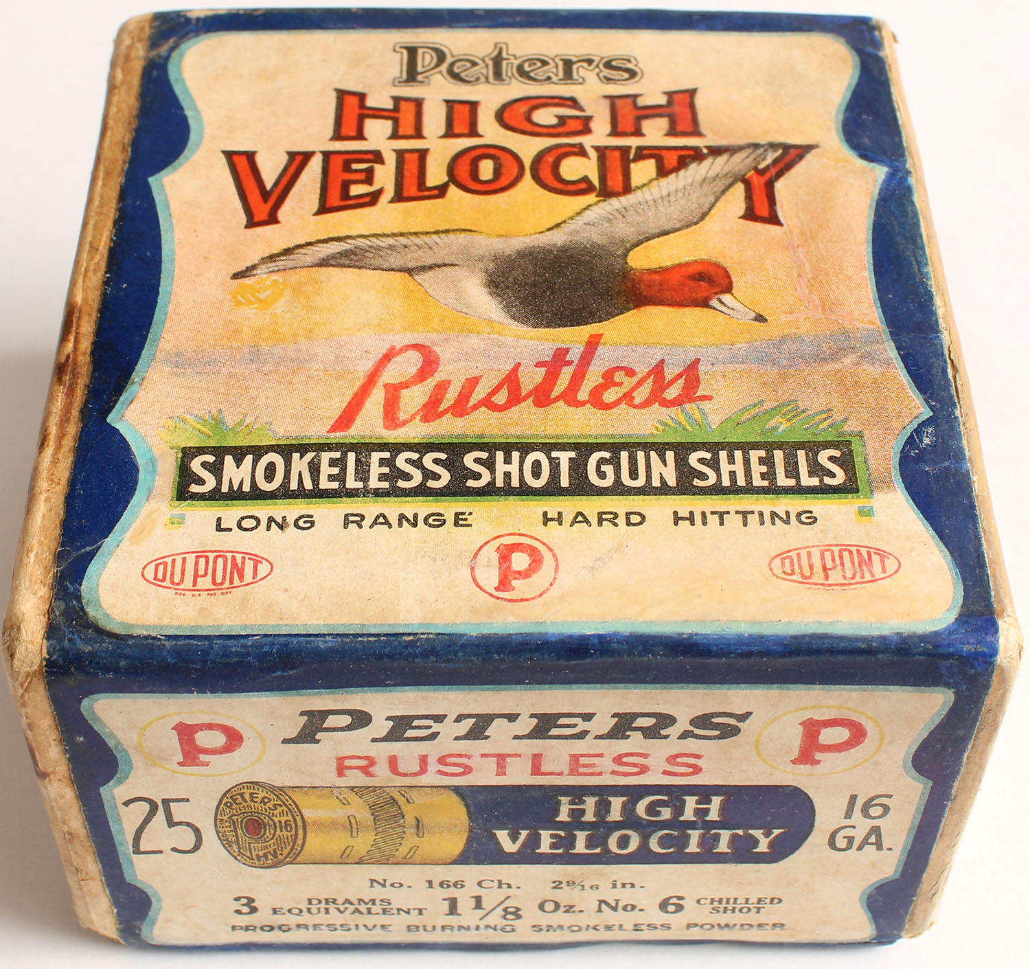 Peters Cart. Co., RED HEAD BOX, 16ga., 2pc., FULL & Professionally RESEALED, shot size 6 Chilled Shot, buff box with multi colored label that pictures RED HEAD in flight, 2 9/16'', Loading: No. 166 Ch, 3 Drams, No. 6 Chilled Shot, box has small shell protrusions, light age soiling with great color to label. Grade: Excellent - Value: 500 to 2000
