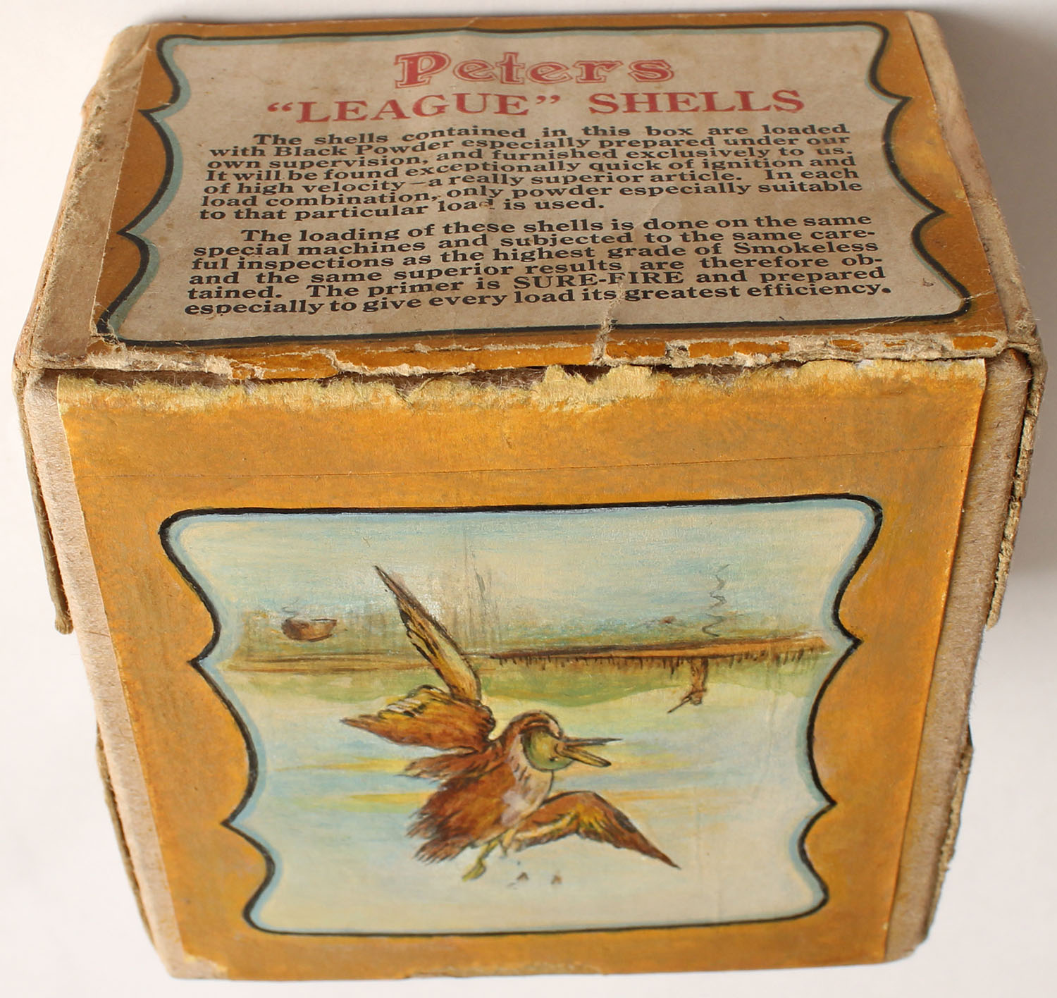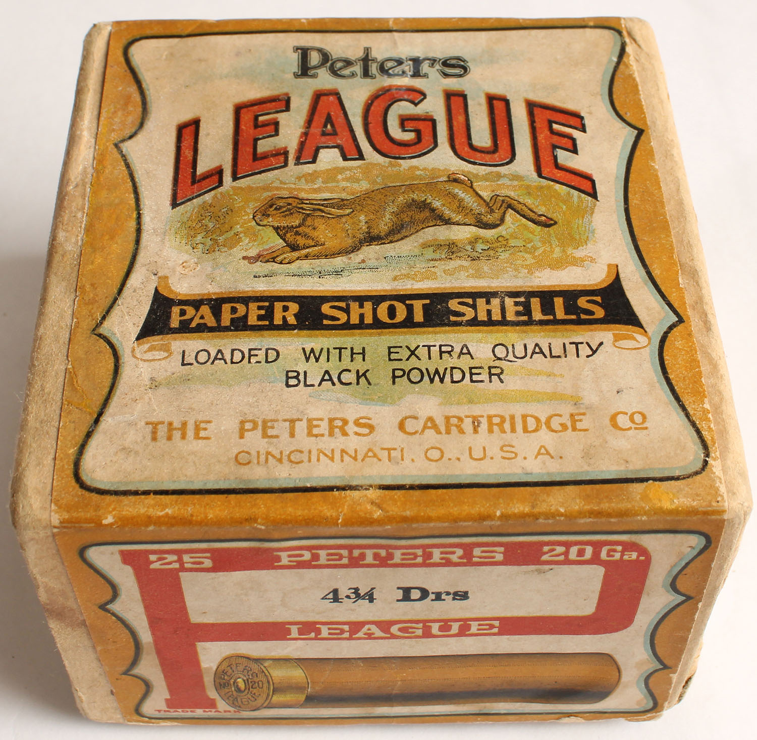 RARE! Peters, LEAGUE RABBIT, 20ga., 2pc., Empty, 4 3/4 Drs, meant for training dogs, buff box with very nice multi colored Rabbit Running scene on front & mallard falling from hunter shooting on back, box is very solid with age soiling, box has very nice colors, has been professionally touched up, blanks for training dogs. VERY RARE & HARD TO FIND! Grade: Very Good ++ - Value: 600 to 2000